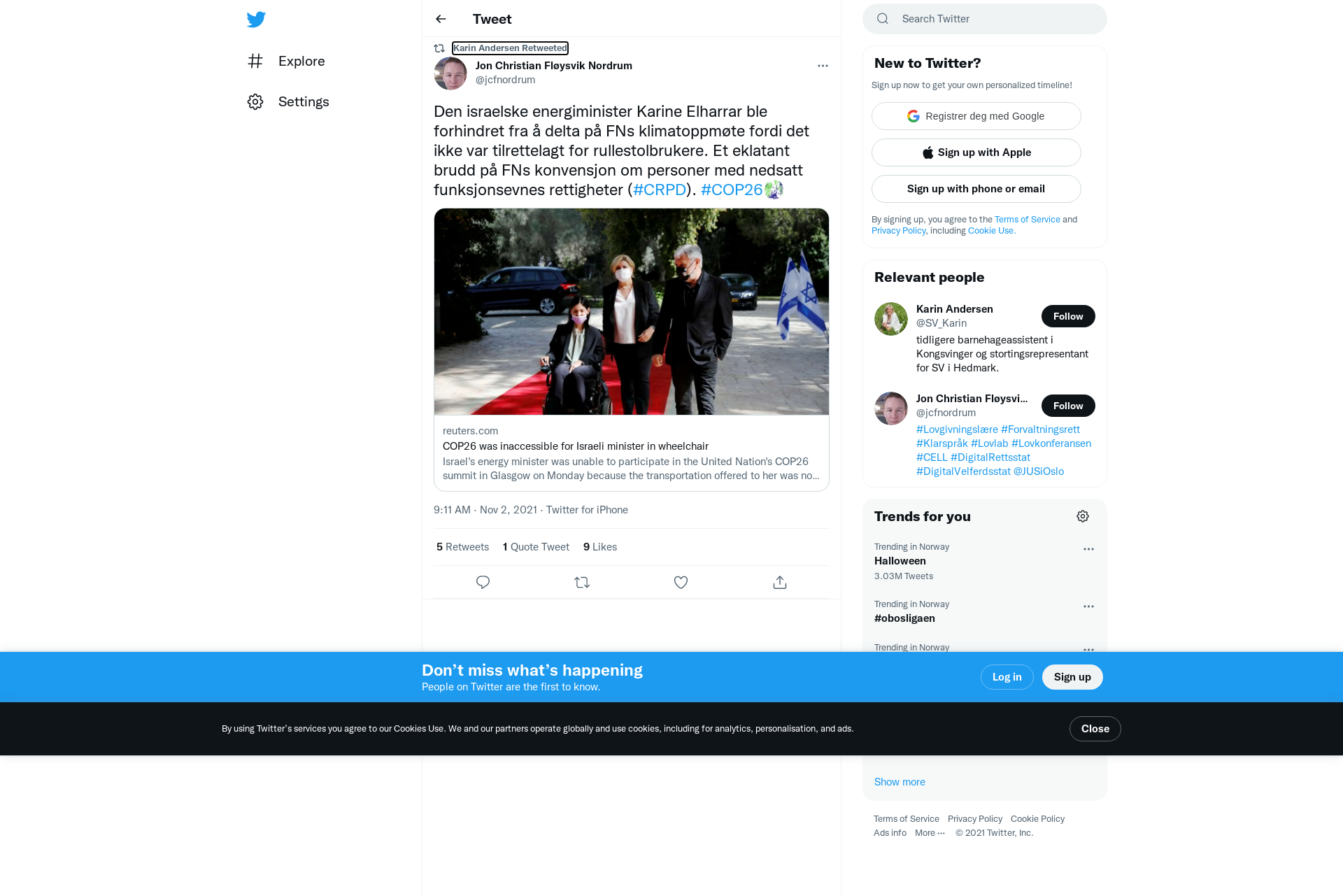 RT @jcfnordrum: Den israelske energiminister Karine Elharrar ble forhindret fra å delta på FNs klimatoppmøte fordi det ikke var tilrettelagt for rullestolbrukere. Et eklatant brudd på FNs konvensjon om personer med nedsatt funksjonsevnes rettigheter (#CRPD). #COP26