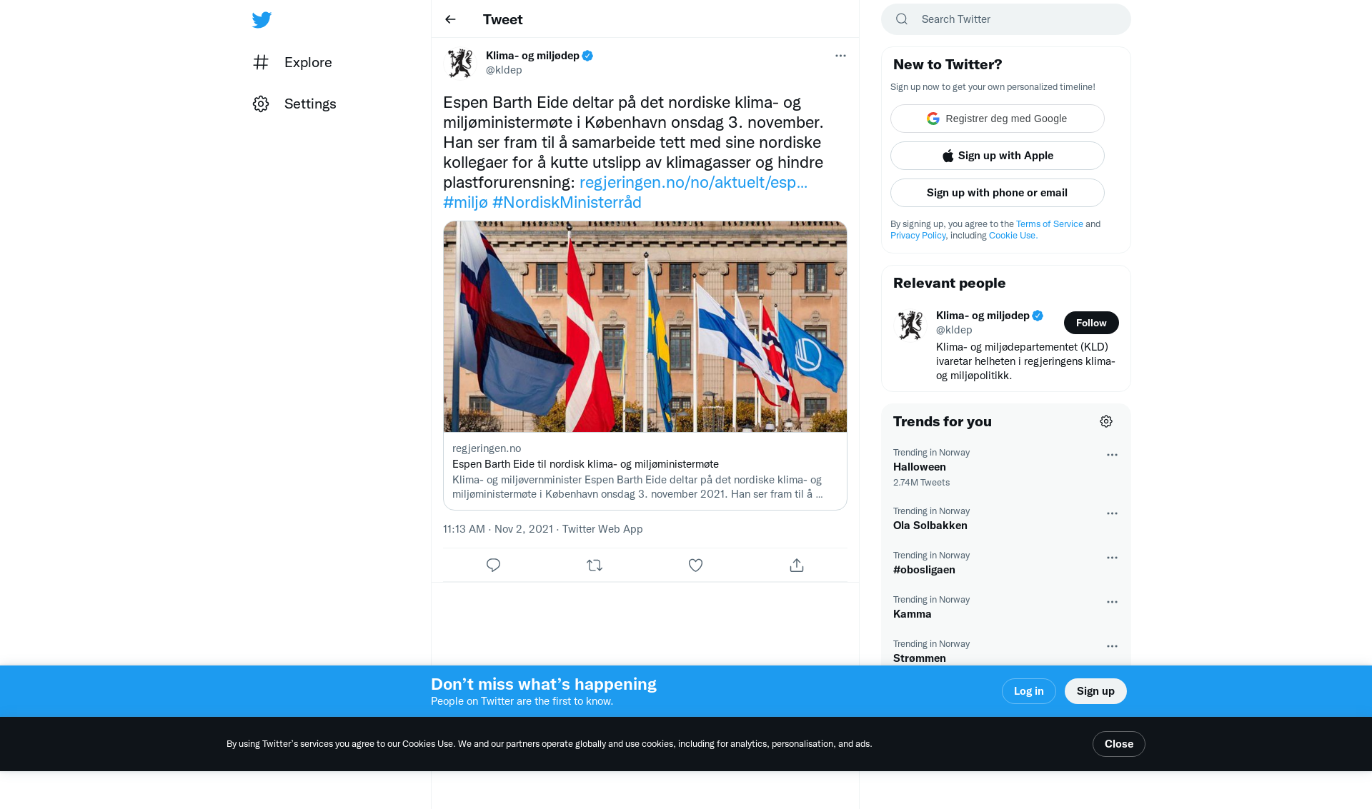 Klima- og miljøvernminister Espen Barth Eide deltar på det nordiske klima- og miljøministermøte i København onsdag 3. november 2021. Han ser fram til å samarbeide tett med sine nordiske kollegaer for å kutte utslipp av klimagasser og hindre plastforurensning.