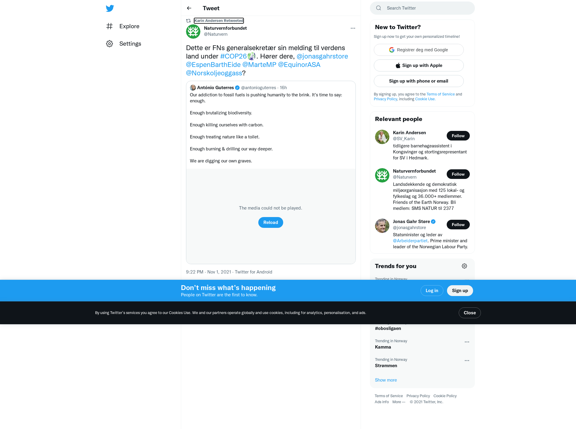 RT @Naturvern: Dette er FNs generalsekretær sin melding til verdens land under #COP26. Hører dere, @jonasgahrstore @EspenBarthEide @MarteMP @EquinorASA @Norskoljeoggass?