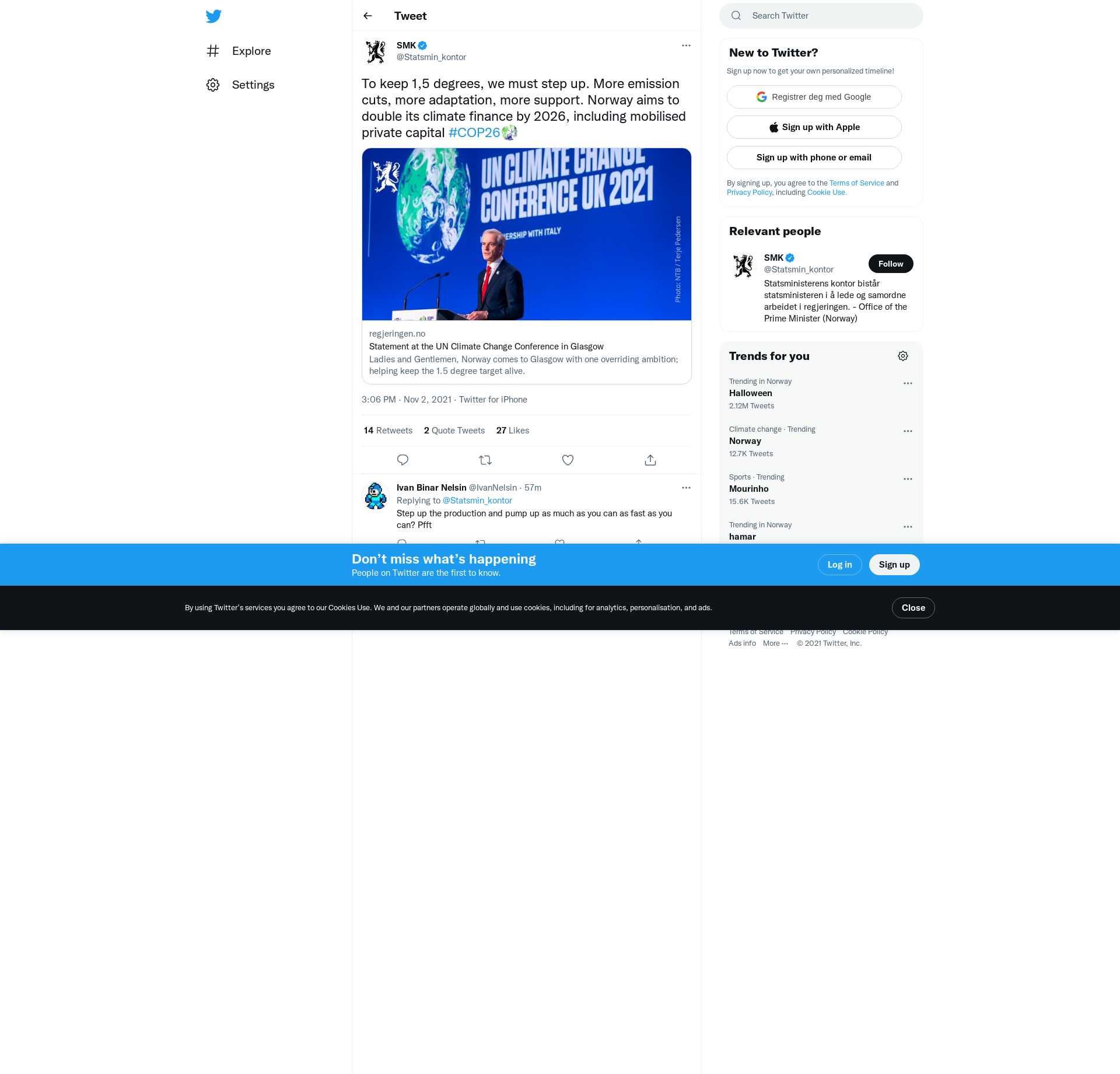 To keep 1,5 degrees, we must step up. More emission cuts, more adaptation, more support. Norway aims to double its climate finance by 2026, including mobilised private capitaI #COP26