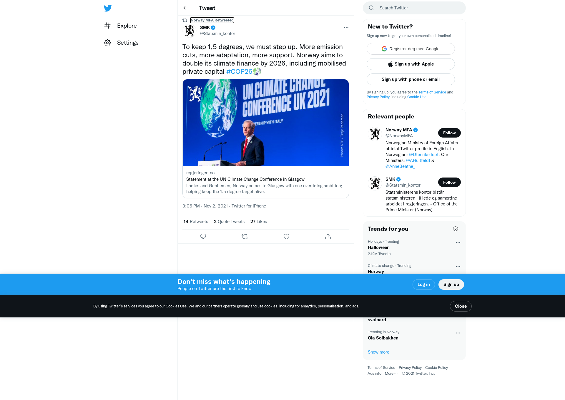 RT @Statsmin_kontor: To keep 1,5 degrees, we must step up. More emission cuts, more adaptation, more support. Norway aims to double its climate finance by 2026, including mobilised private capitaI #COP26