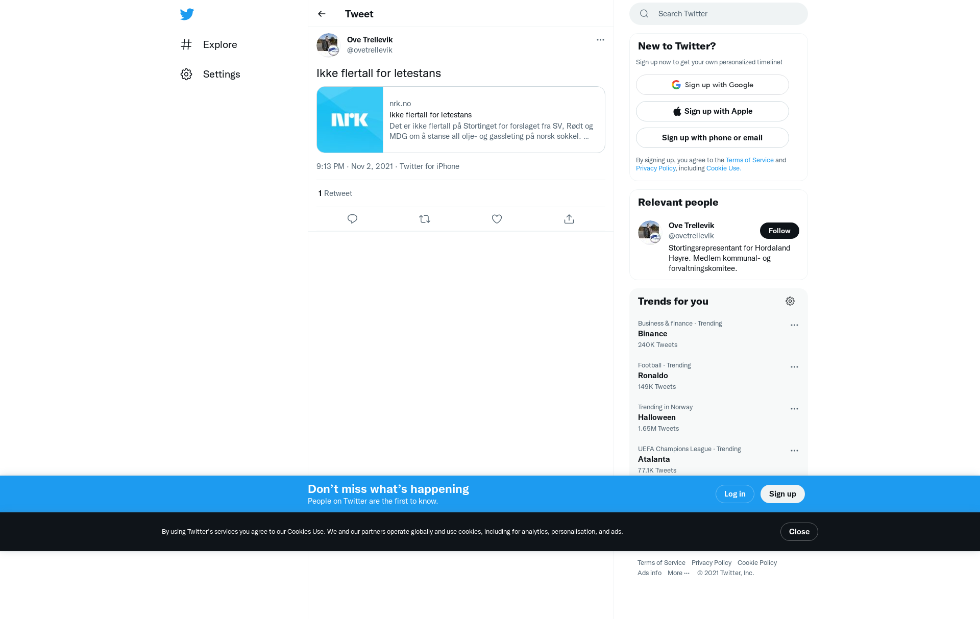 Det er ikke flertall på Stortinget for forslaget fra SV, Rødt og MDG om å stanse all olje- og gassleting på norsk sokkel. Hverken regjeringen eller Høyre vil støtte forslaget. Det er klart etter at olje- og energiminister Marte Mjøs Persen har sendt et brev til Stortingets energi- og miljøkomite der hun gjør det klart at regjeringen ikke vil stemme for forslaget. Også Høyre sier nei til forslaget, som det da ikke er mulig å få flertal for. – Høyre er tilfreds med at regjeringen viderefører Solberg regjeringen sin politikk på området, og Høyre kommer ikke til å støtte forslagstillerne sitt forslag om stans i all leting etter olje og gass. Det sier Ove Trellevik, talsperson for Høyres petroleumspolitikk, til NRK.