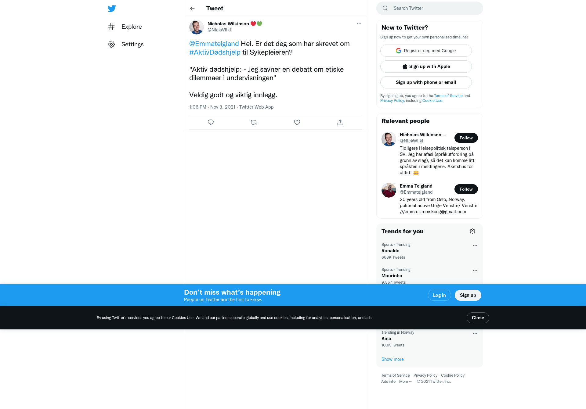 @Emmateigland Hei. Er det deg som har skrevet om #AktivDødshjelp til Sykepleieren? "Aktiv dødshjelp: - Jeg savner en debatt om etiske dilemmaer i undervisningen" Veldig godt og viktig innlegg.