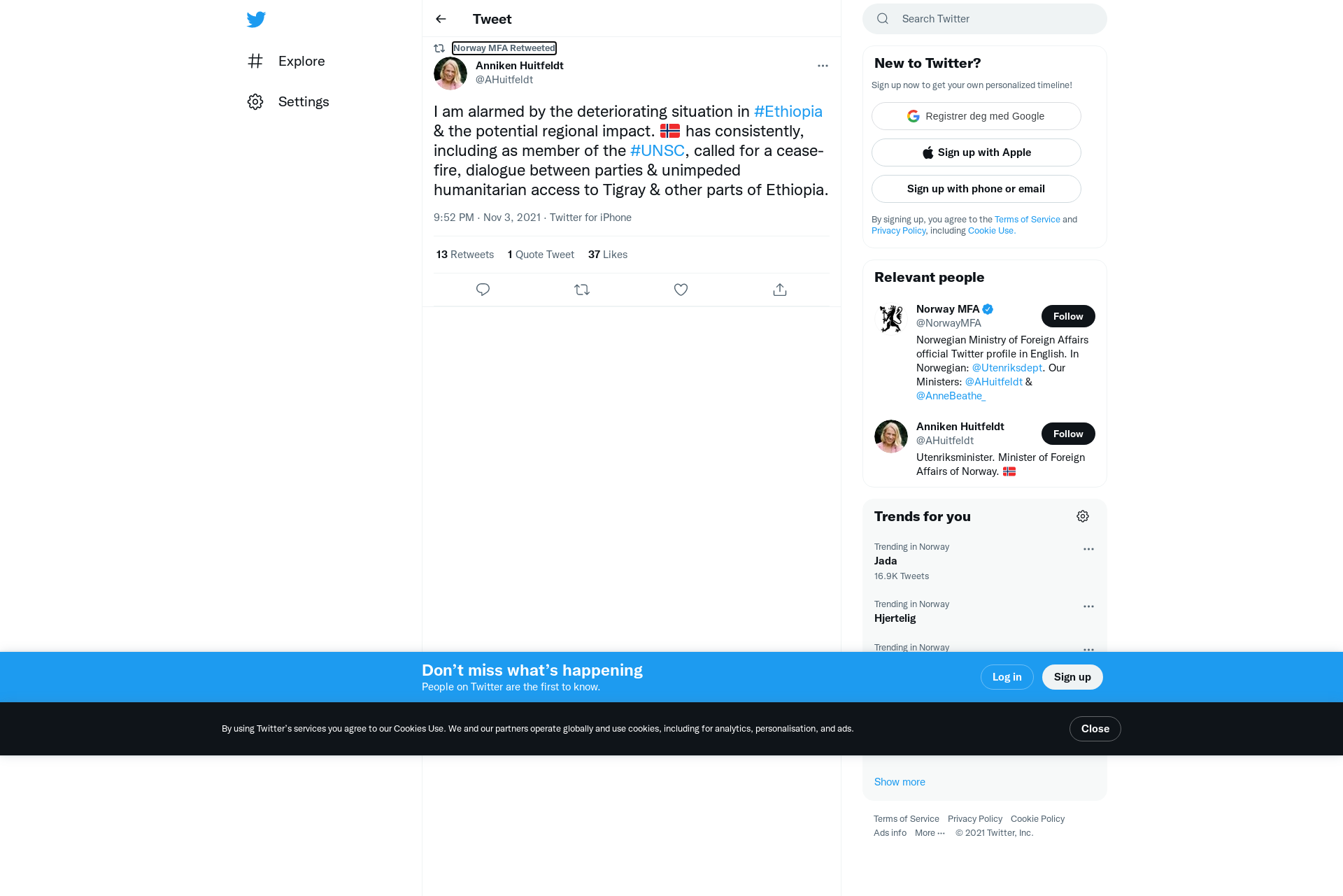 RT @AHuitfeldt: I am alarmed by the deteriorating situation in #Ethiopia & the potential regional impact. 🇳🇴 has consistently, including as member of the #UNSC, called for a cease-fire, dialogue between parties & unimpeded humanitarian access to Tigray & other parts of Ethiopia.