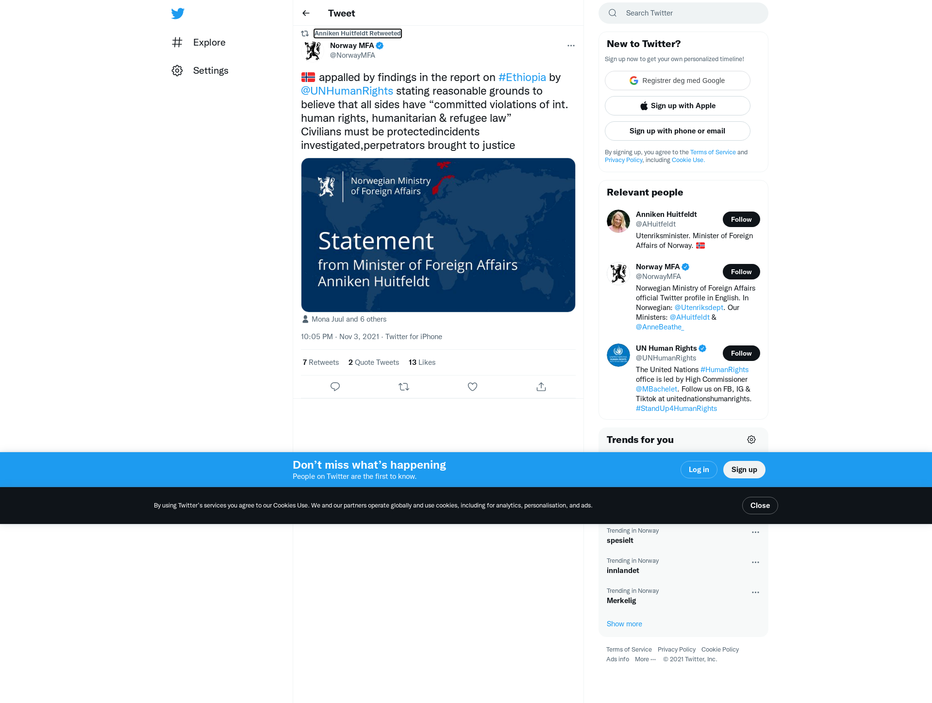 RT @NorwayMFA: 🇳🇴 appalled by findings in the report on #Ethiopia by @UNHumanRights stating reasonable grounds to believe that all sides have “committed violations of int. human rights, humanitarian & refugee law”