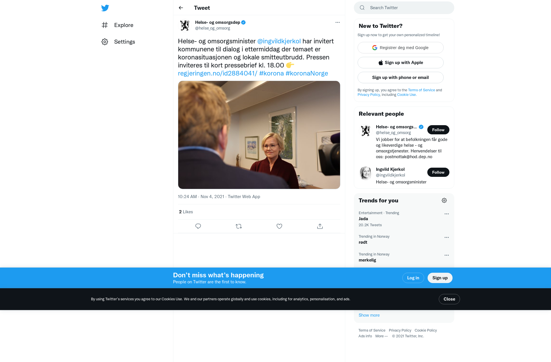 Helse- og omsorgsminister Ingvild Kjerkol har invitert kommunene til dialog i ettermiddag der temaet er koronasituasjonen og lokale smitteutbrudd. Pressen inviteres til kort pressebrief kl. 18.00. Helsedirektør Bjørn Guldvog og direktør i Folkehelseins...
