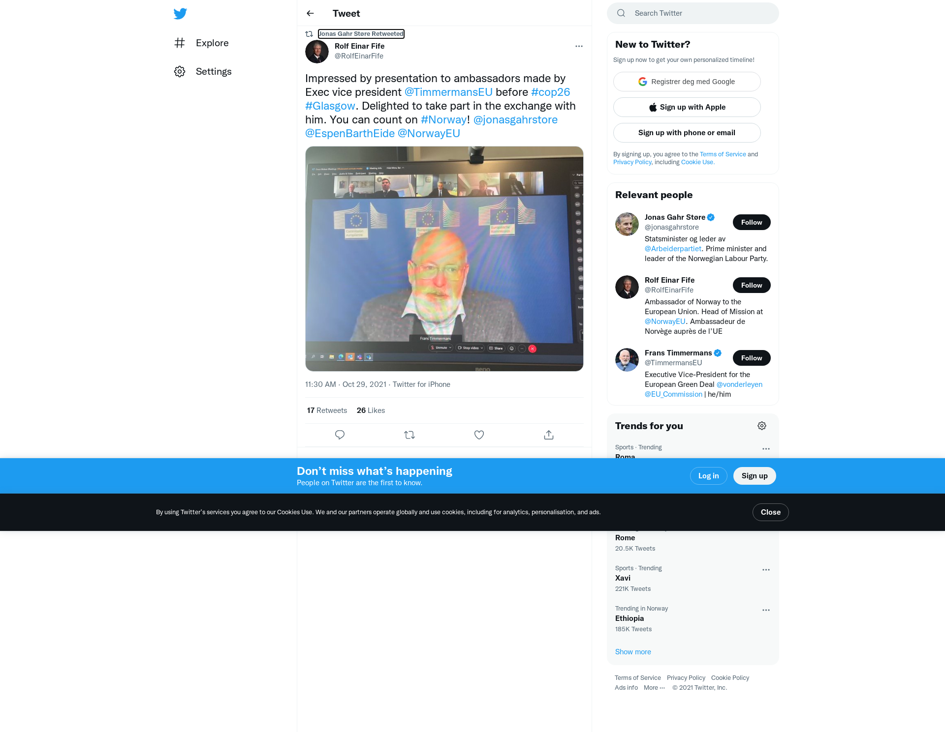 RT @RolfEinarFife: Impressed by presentation to ambassadors made by Exec vice president @TimmermansEU before #cop26 #Glasgow. Delighted to take part in the exchange with him. You can count on #Norway! @jonasgahrstore @EspenBarthEide @NorwayEU https://t.co/SeMdy1GeXI