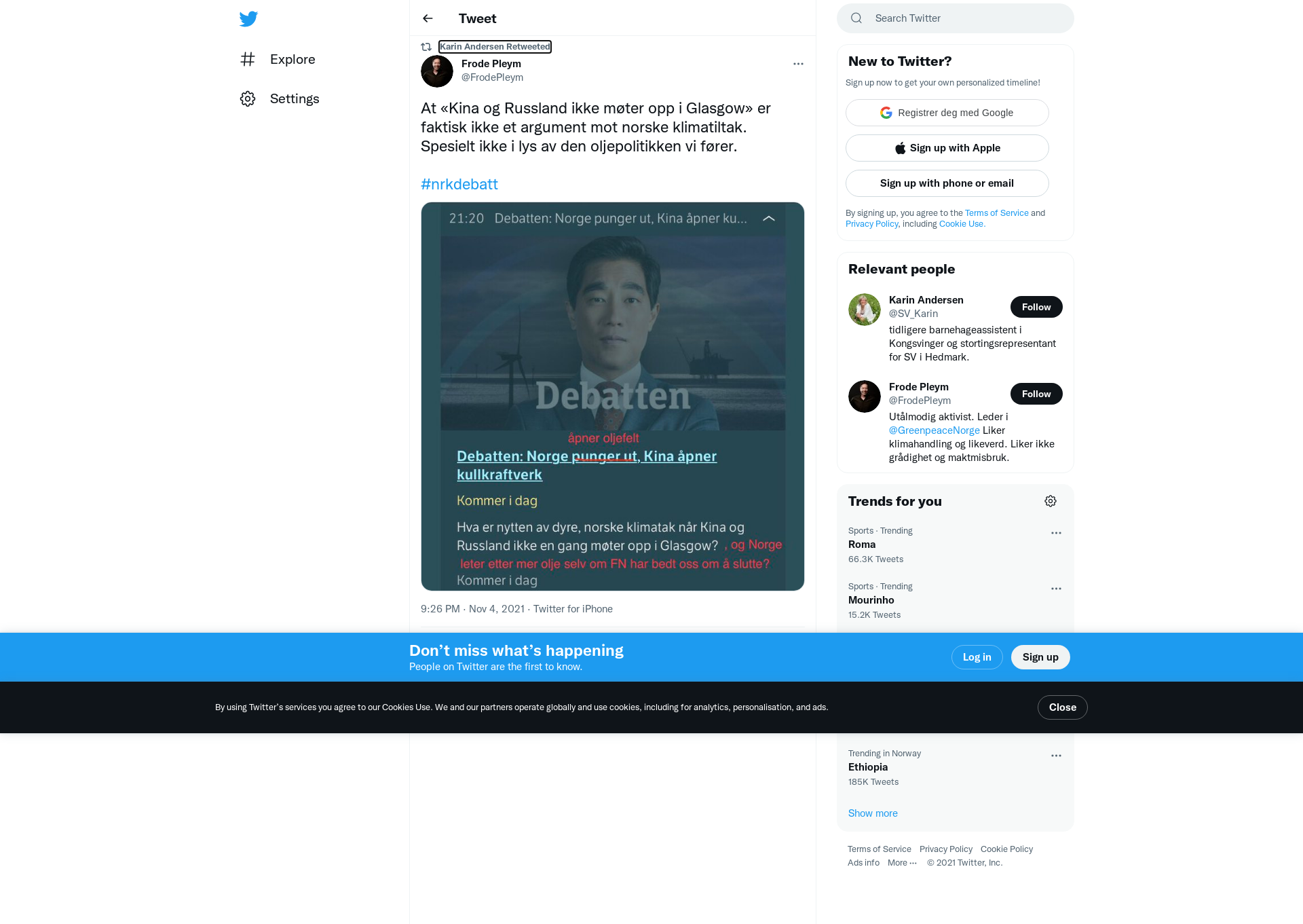 RT @FrodePleym: At «Kina og Russland ikke møter opp i Glasgow» er faktisk ikke et argument mot norske klimatiltak. Spesielt ikke i lys av den oljepolitikken vi fører.