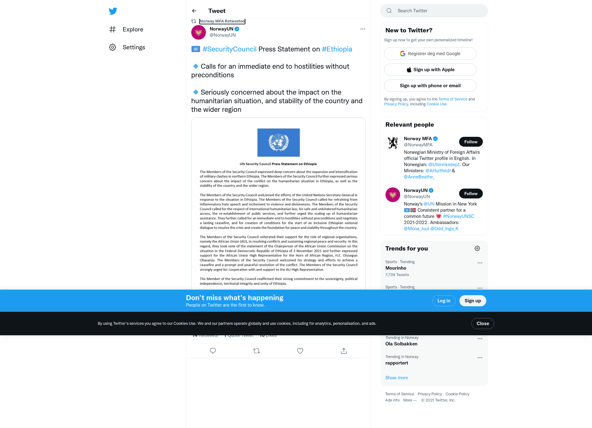 RT @NorwayUN: 🇺🇳 #SecurityCouncil Press Statement on #Ethiopia 🔹Calls for an immediate end to hostilities without preconditions 🔹Serious…
