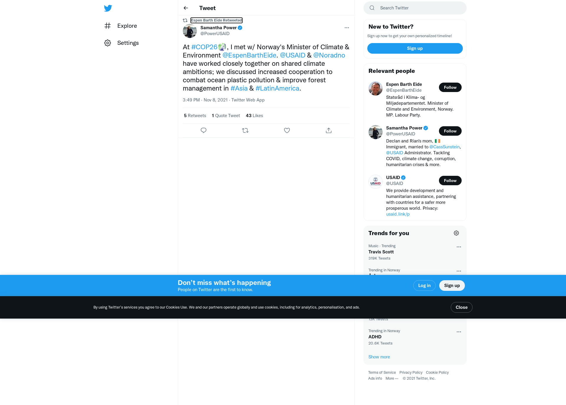 RT @PowerUSAID: At #COP26, I met w/ Norway's Minister of Climate & Environment @EspenBarthEide. @USAID & @Noradno have worked closely together on shared climate ambitions; we discussed increased cooperation to combat ocean plastic pollution & improve forest management in #Asia & #LatinAmerica.