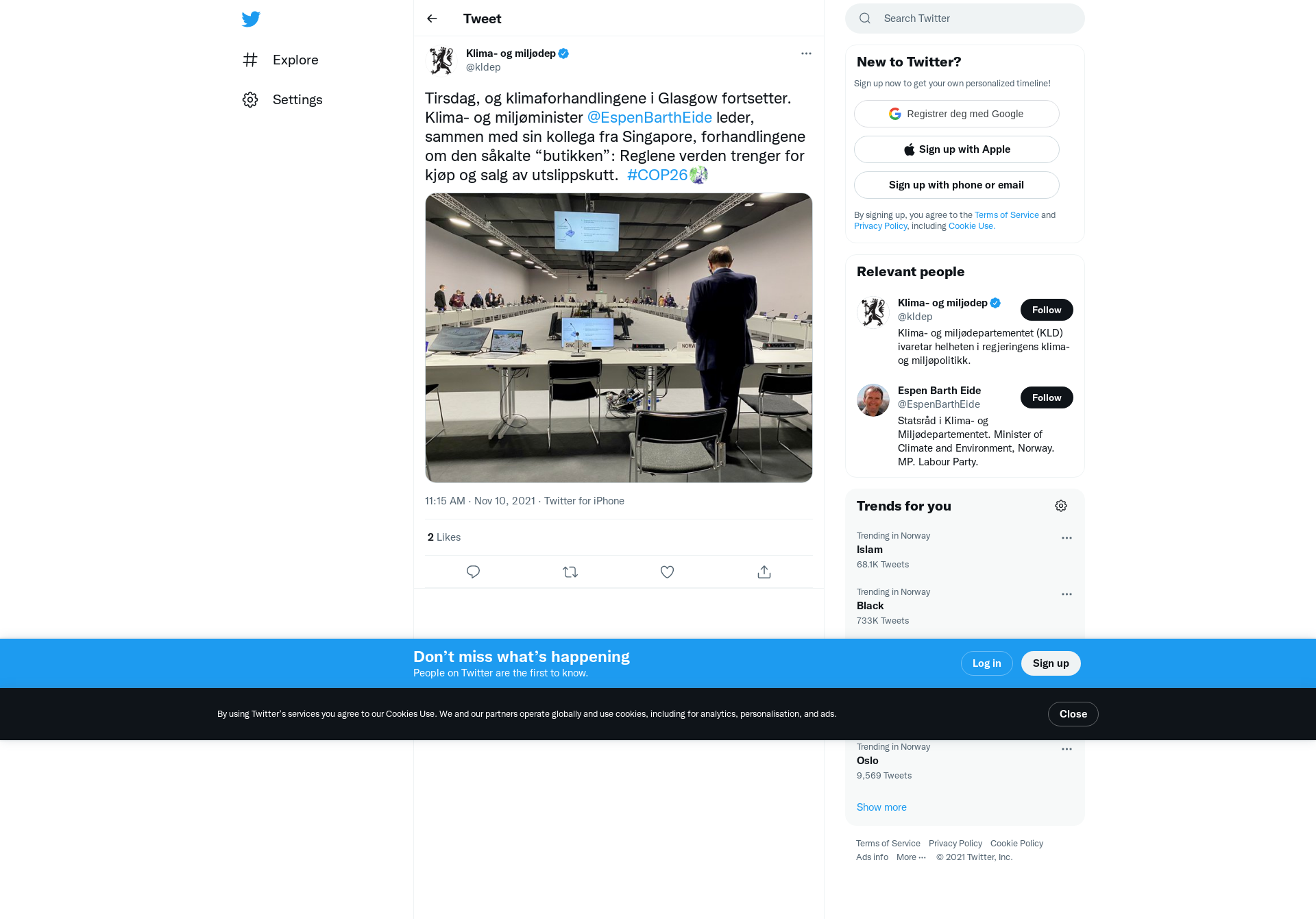 Tirsdag, og klimaforhandlingene i Glasgow fortsetter. Klima- og miljøminister @EspenBarthEide leder, sammen med sin kollega fra Singapore, forhandlingene om den såkalte “butikken”: Reglene verden trenger for kjøp og salg av utslippskutt.  #COP26 https://t.co/rS6KHCwpOL