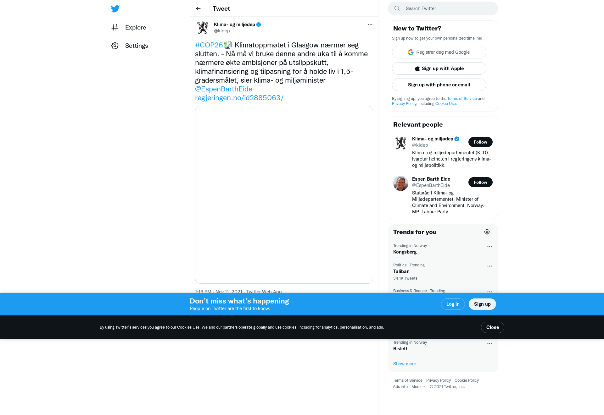 #COP26 Klimatoppmøtet i Glasgow nærmer seg slutten. - Nå må vi bruke denne andre uka til å komme nærmere økte ambisjoner på utslippskutt, klimafinansiering og tilpasning for å holde liv i 1,5-gradersmålet, sier klima- og miljøminister @EspenBarthEide