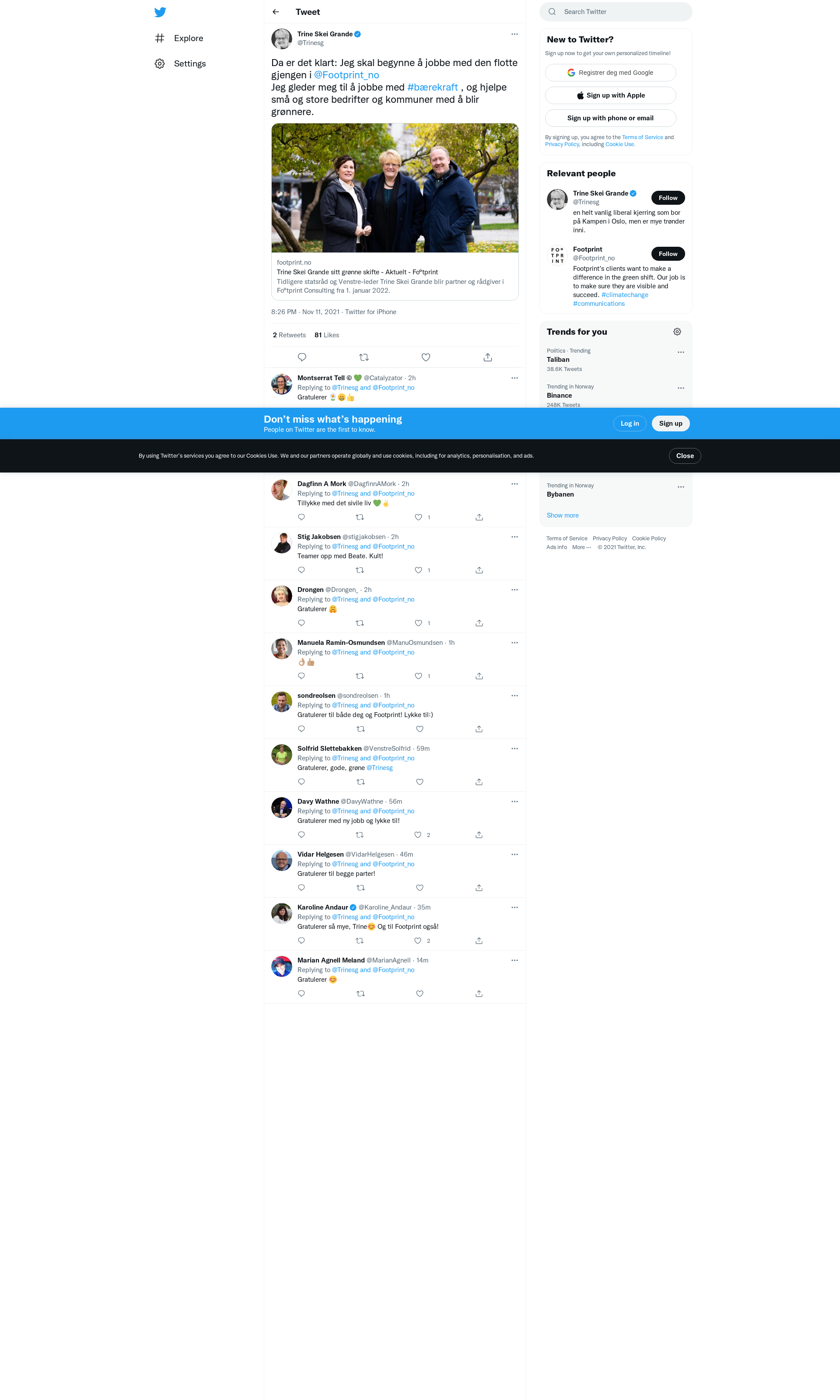 Da er det klart: Jeg skal begynne å jobbe med den flotte gjengen i @Footprint_no Jeg gleder meg til å jobbe med #bærekraft , og hjelpe små og store bedrifter og kommuner med å blir grønnere. https://t.co/eTsfSvdFfB
