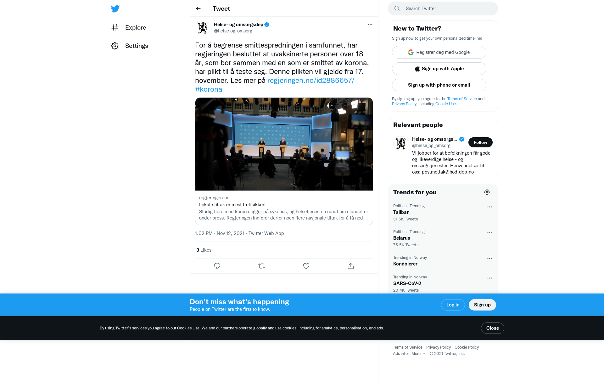 For å begrense smittespredningen i samfunnet, har regjeringen besluttet at uvaksinerte personer over 18 år, som bor sammen med en som er smittet av korona, har plikt til å teste seg. Denne plikten vil gjelde fra 17. november. Les mer på https://t.co/4lKvT16cZE #korona