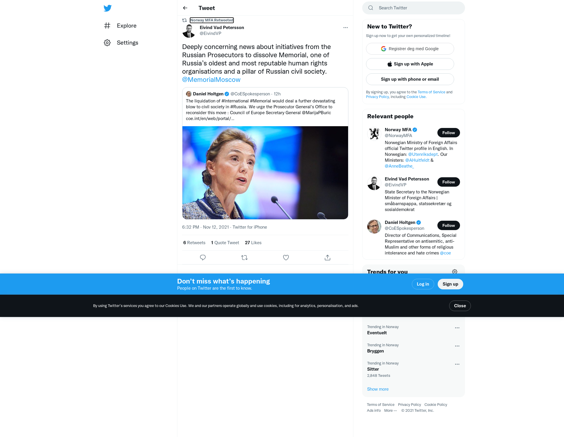 RT @EivindVP: Deeply concerning news about initiatives from the Russian Prosecutors to dissolve Memorial, one of Russia’s oldest and most reputable human rights organisations and a pillar of Russian civil society. @MemorialMoscow