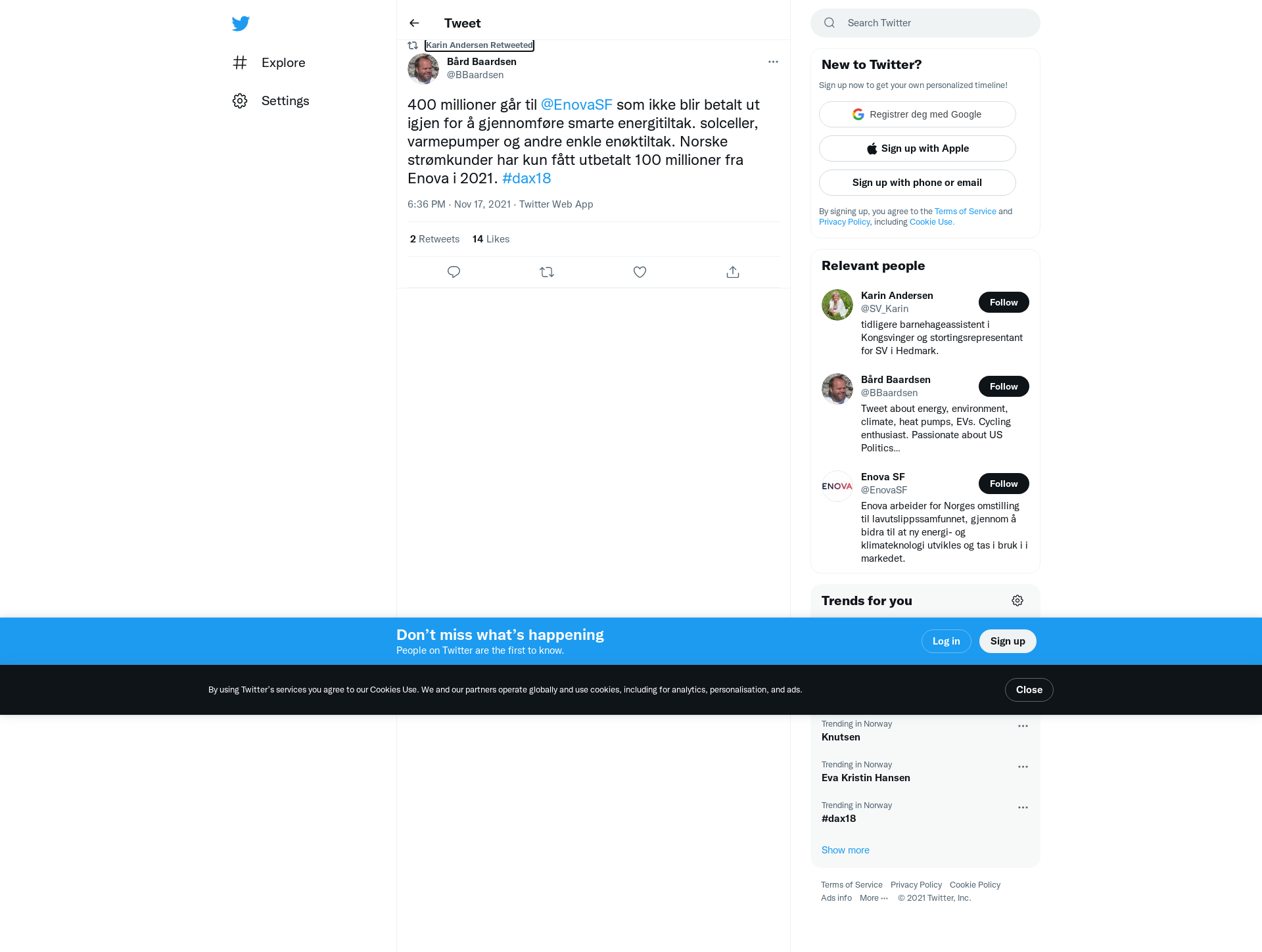 RT @BBaardsen: 400 millioner går til @EnovaSF som ikke blir betalt ut igjen for å gjennomføre smarte energitiltak. solceller, varmepumper og andre enkle enøktiltak. Norske strømkunder har kun fått utbetalt 100 millioner fra Enova i 2021. #dax18
