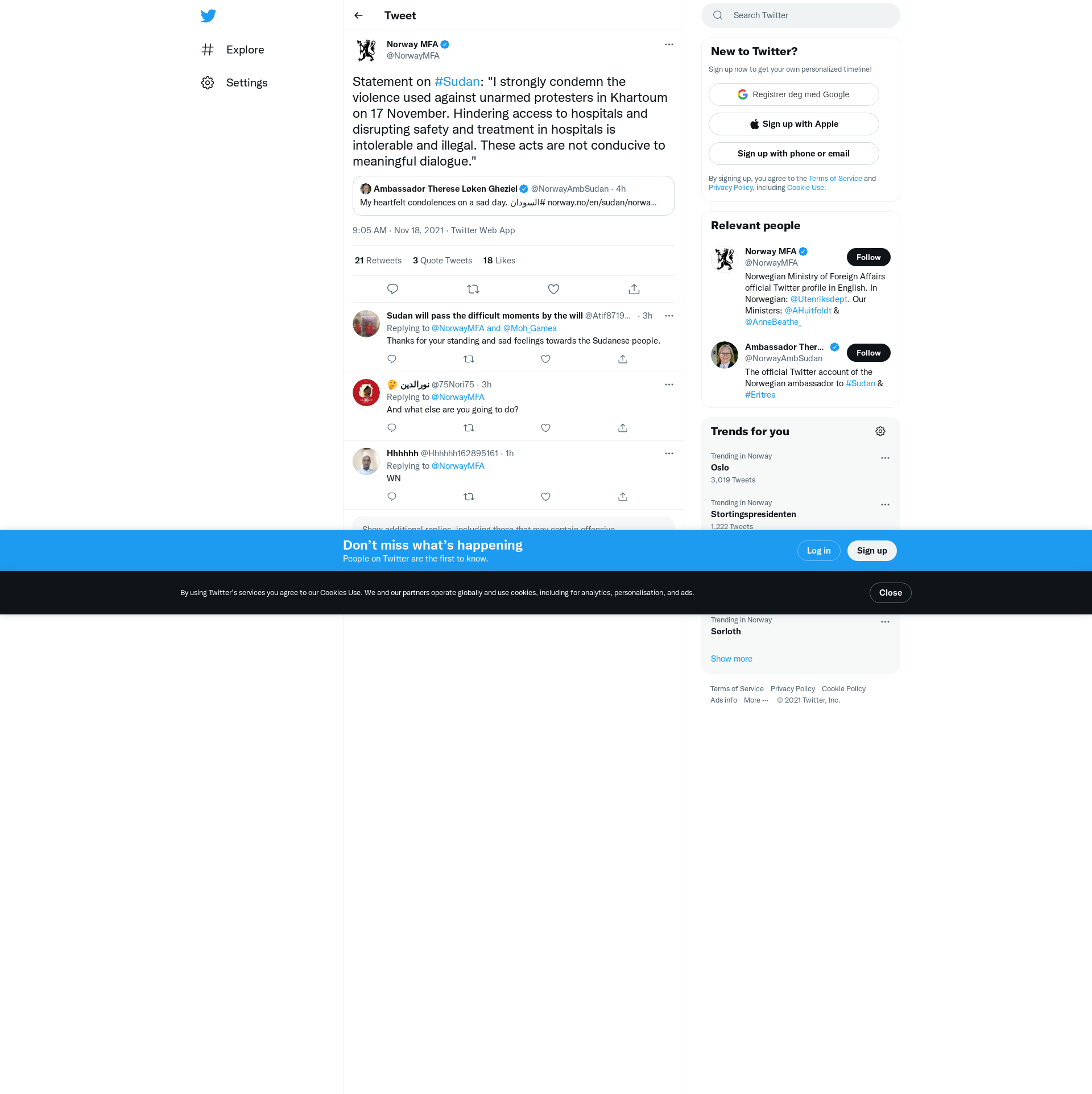 I strongly condemn the violence used against unarmed protesters in Khartoum on 17 November. Hindering access to hospitals and disrupting safety and treatment in hospitals is intolerable and illegal. As is the way all communications have been shut down. These acts are not conducive to meaningful dialogue. We call on the de facto authorities to respect and fulfill their responsibility for protecting civilians and ensure the safety of peaceful protesters. The Sudanese people have the right to freely express