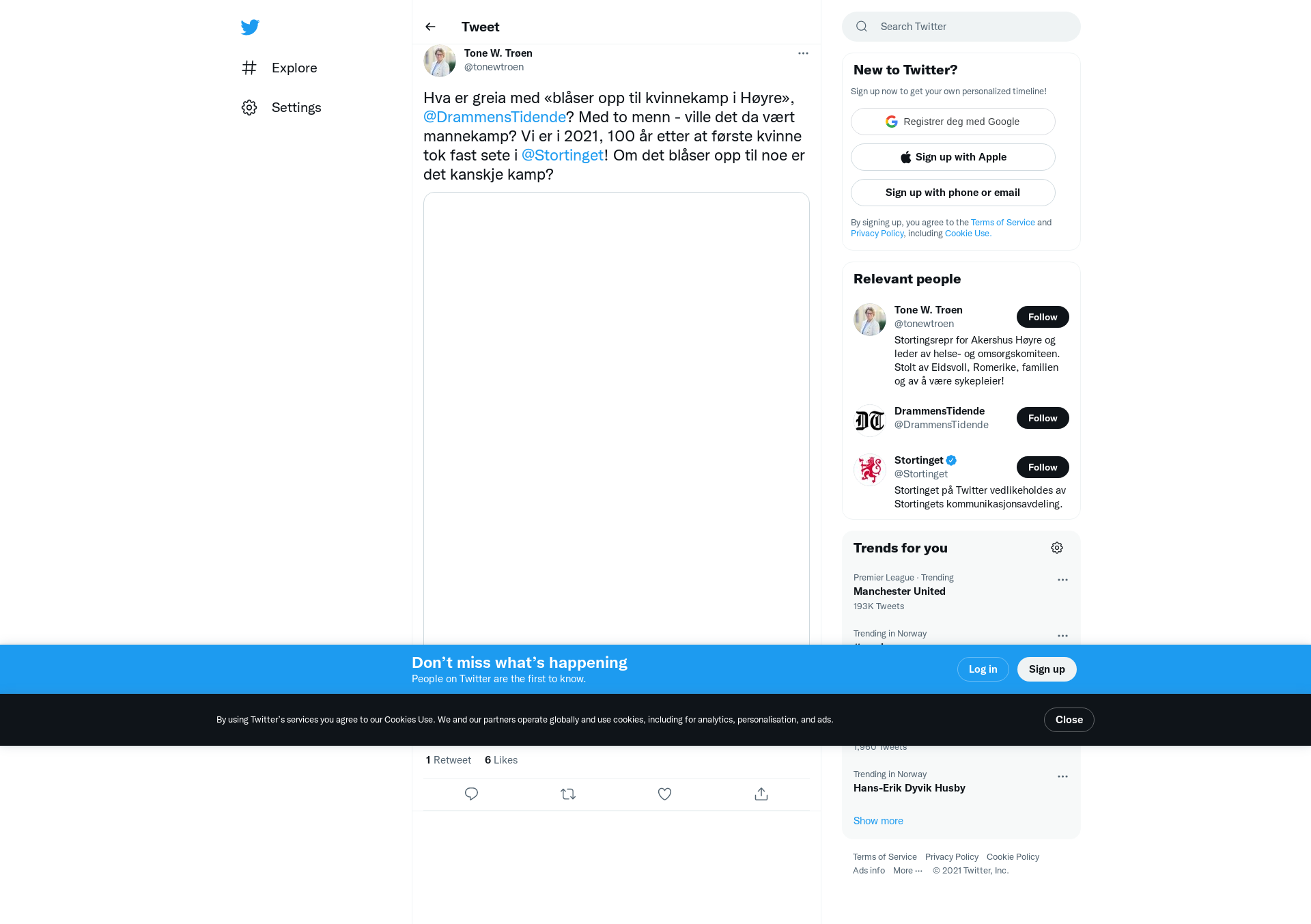 Hva er greia med «blåser opp til kvinnekamp i Høyre», @DrammensTidende? Med to menn - ville det da vært mannekamp? Vi er i 2021, 100 år etter at første kvinne tok fast sete i @Stortinget! Om det blåser opp til noe er det kanskje kamp? https://t.co/DudzetSGkO