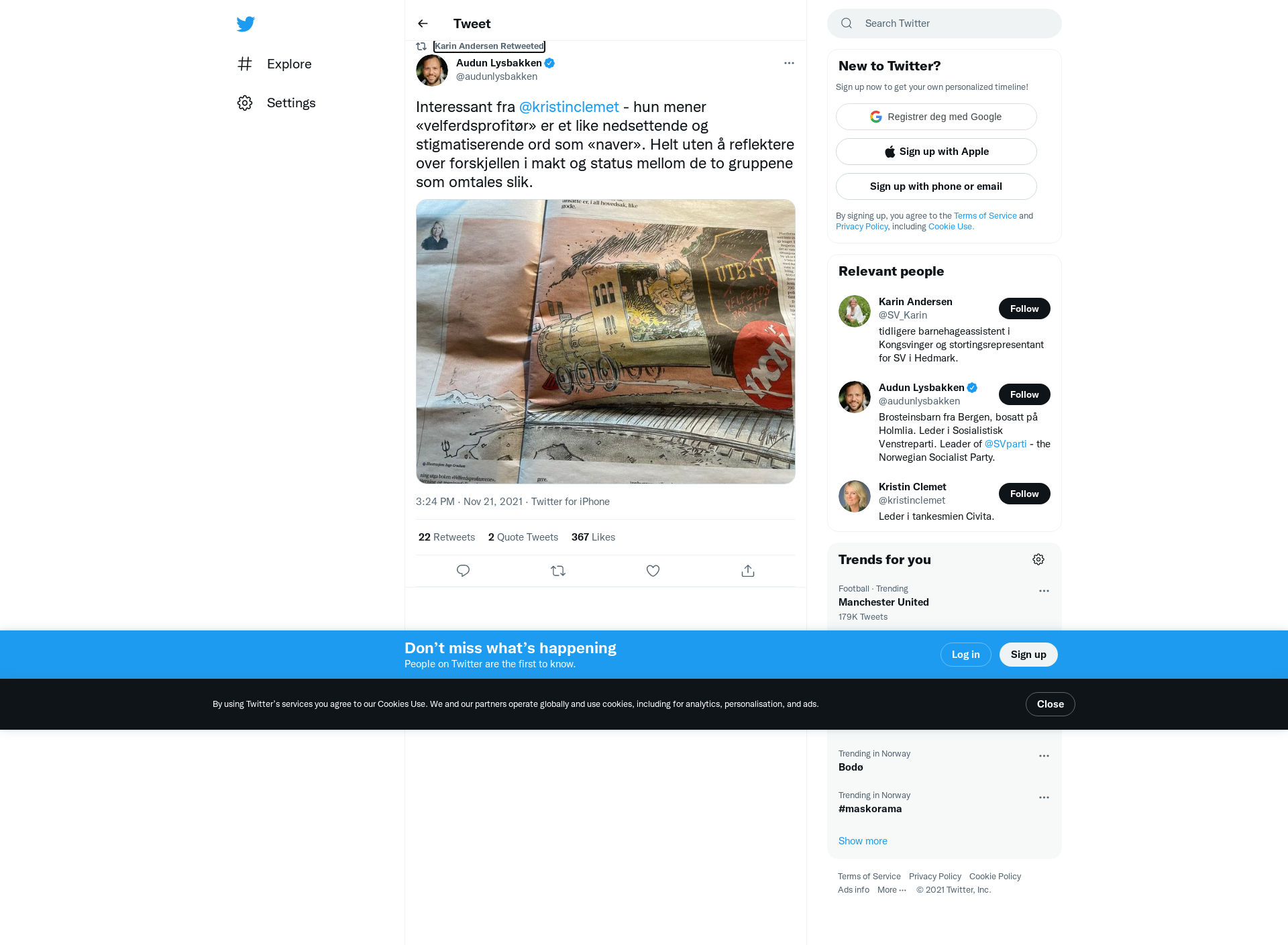 RT @audunlysbakken: Interessant fra @kristinclemet - hun mener «velferdsprofitør» er et like nedsettende og stigmatiserende ord som «naver». Helt uten å reflektere over forskjellen i makt og status mellom de to gruppene som omtales slik. https://t.co/JzExhDEbEo