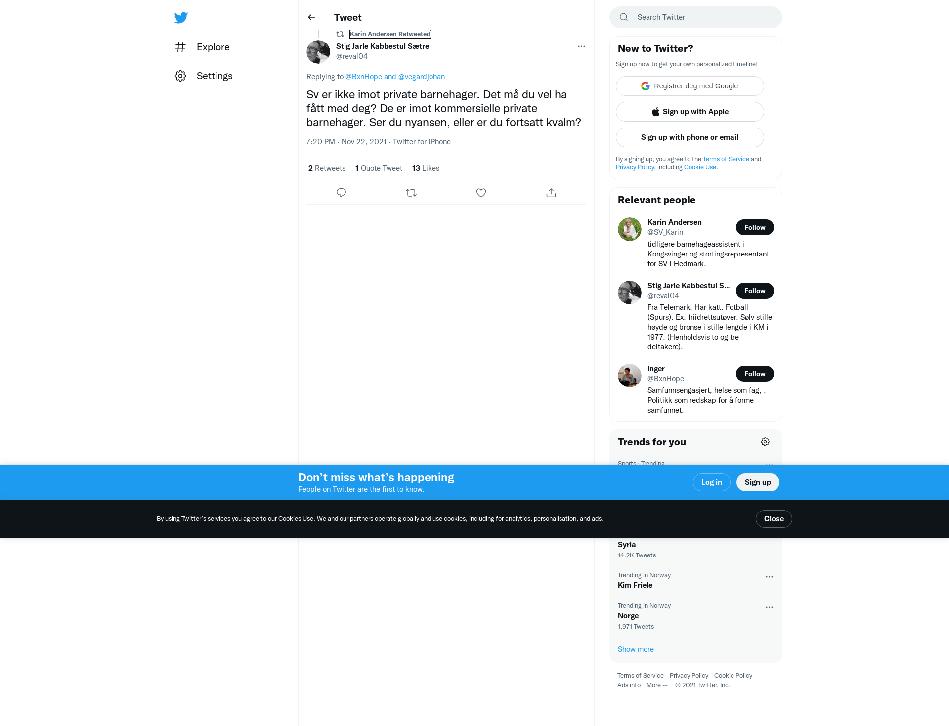 RT @reval04: @BxnHope @vegardjohan Sv er ikke imot private barnehager. Det må du vel ha fått med deg? De er imot kommersielle private barnehager. Ser du nyansen, eller er du fortsatt kvalm?