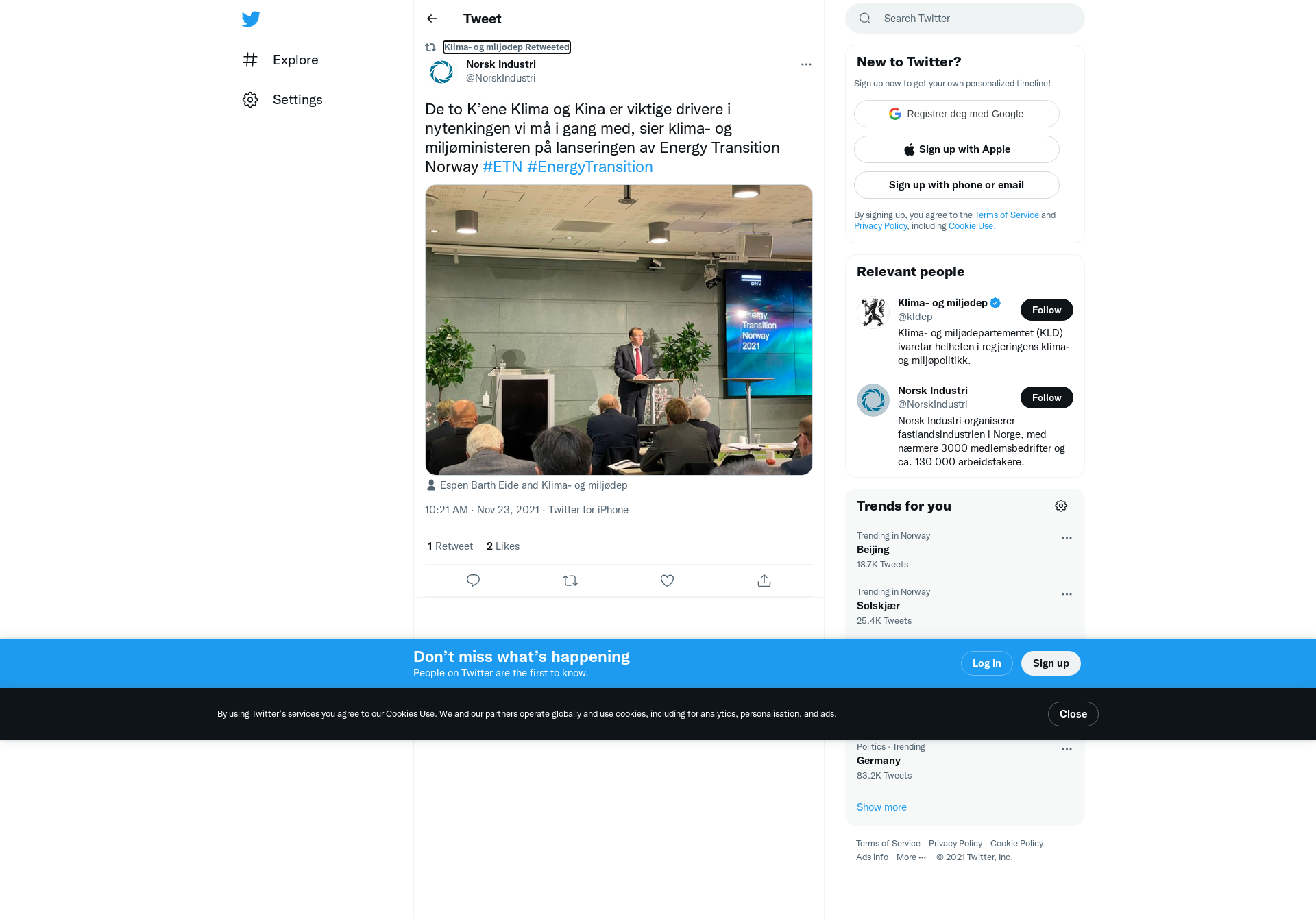 RT @NorskIndustri: De to K’ene Klima og Kina er viktige drivere i nytenkingen vi må i gang med, sier klima- og miljøministeren på lanseringen av Energy Transition Norway #ETN #EnergyTransition https://t.co/rd2fDvxcVZ
