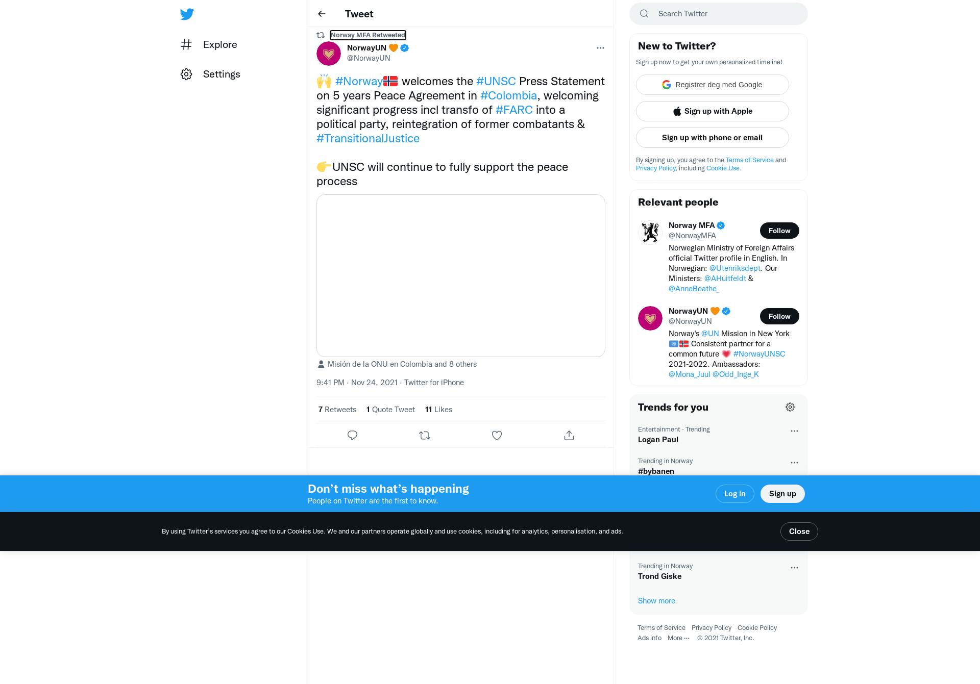 RT @NorwayUN: 🙌 #Norway🇳🇴 welcomes the #UNSC Press Statement on 5 years Peace Agreement in #Colombia, welcoming significant progress incl transfo of #FARC into a political party, reintegration of former combatants & #TransitionalJustice