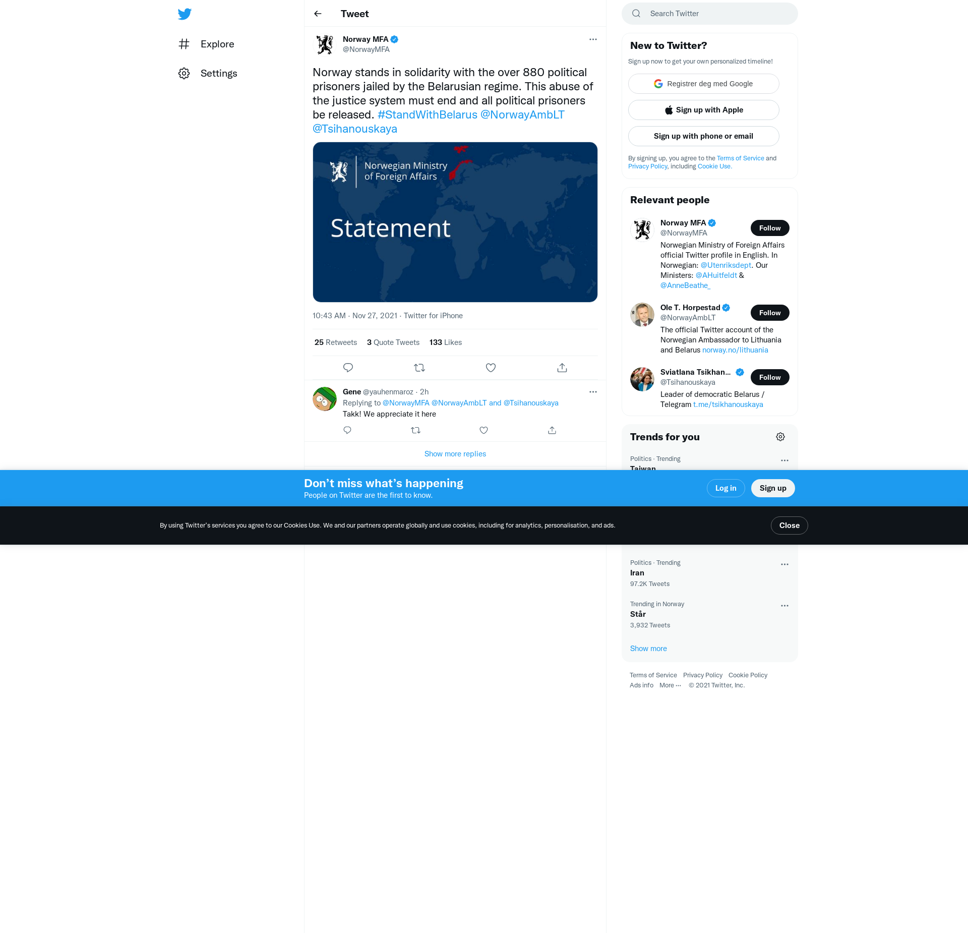 Norway stands in solidarity with the over 880 political prisoners jailed by the Belarusian regime. This abuse of the justice system must end and all political prisoners be released. #StandWithBelarus @NorwayAmbLT @Tsihanouskaya https://t.co/5l5B5am3af