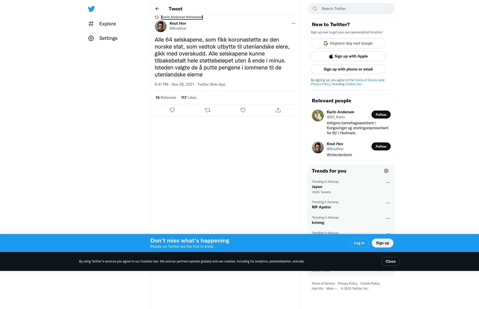 RT @Knuthov: Alle 64 selskapene, som fikk koronastøtte av den norske stat, som vedtok utbytte til utenlandske eiere, gikk med overskudd. Alle selskapene kunne tilbakebetalt hele støttebeløpet uten å ende i minus. Isteden valgte de å putte pengene i lommene til de utenlandske eierne