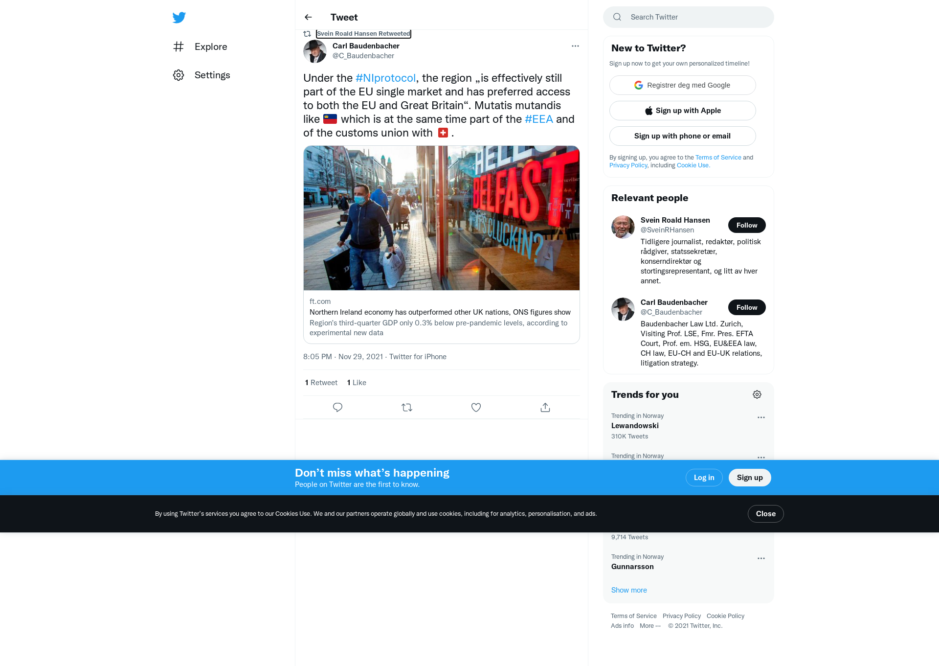 RT @C_Baudenbacher: Under the #NIprotocol, the region „is effectively still part of the EU single market and has preferred access to both the EU and Great Britain“. Mutatis mutandis like 🇱🇮 which is at the same time part of the #EEA and of the customs union with 🇨🇭. https://t.co/CkjCohZijn
