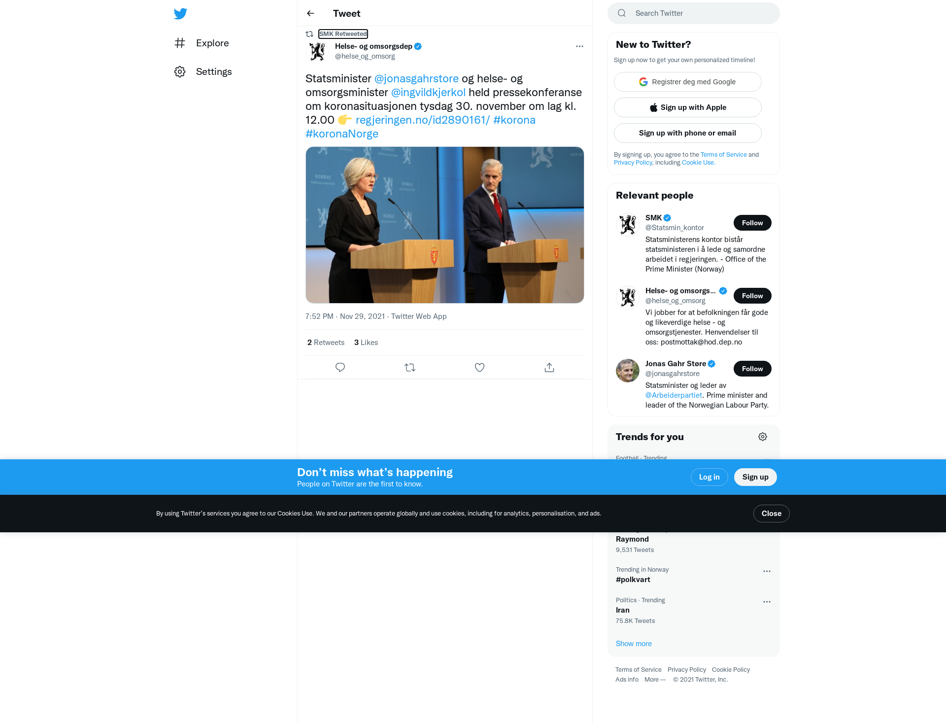 RT @helse_og_omsorg: Statsminister @jonasgahrstore og helse- og omsorgsminister @ingvildkjerkol held pressekonferanse om koronasituasjonen tysdag 30. november om lag kl. 12.00 👉 https://t.co/b9s1VKBcyO #korona #koronaNorge https://t.co/CUmdfRwhmT