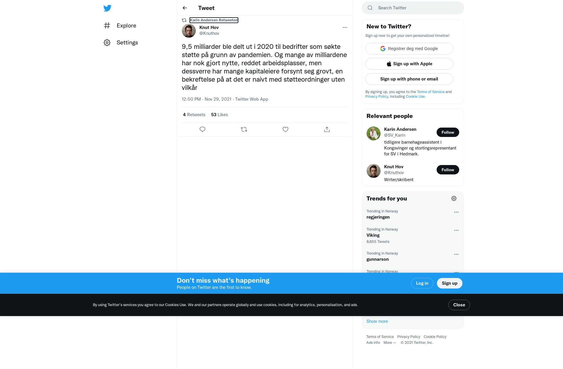 RT @Knuthov: 9,5 milliarder ble delt ut i 2020 til bedrifter som søkte støtte på grunn av pandemien. Og mange av milliardene har nok gjort nytte, reddet arbeidsplasser, men dessverre har mange kapitaleiere forsynt seg grovt, en bekreftelse på at det er naivt med støtteordninger uten vilkår