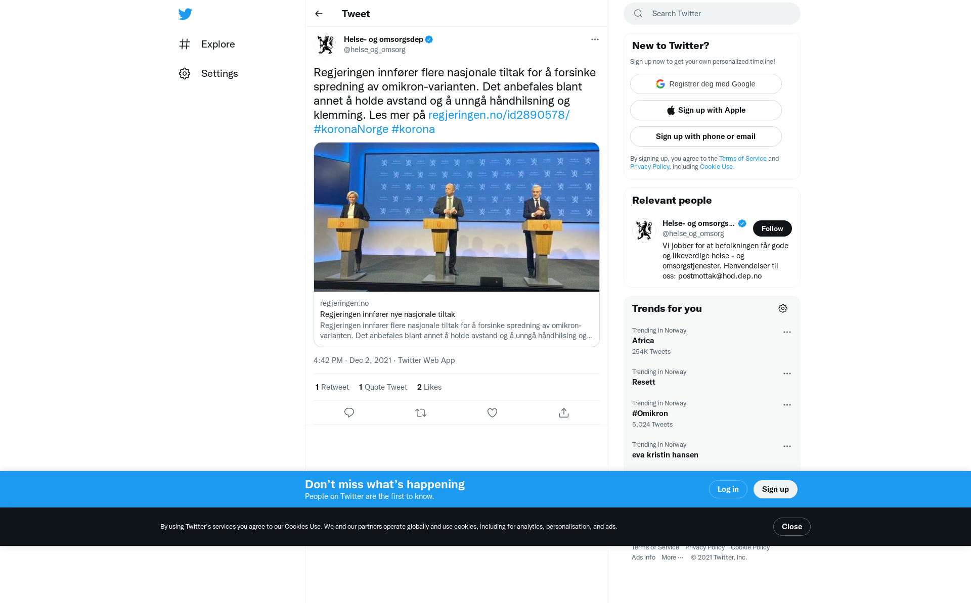 Regjeringen innfører flere nasjonale tiltak for å forsinke spredning av omikron-varianten. Det anbefales blant annet å holde avstand og å unngå håndhilsning og klemming. Les mer på https://t.co/peBKzIHDLp #koronaNorge #korona