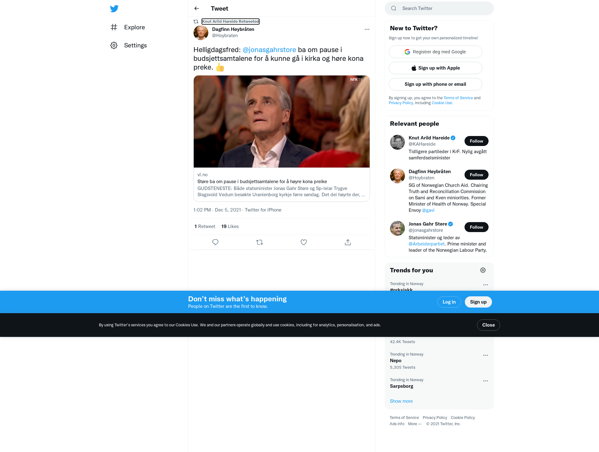 RT @Hoybraten: Helligdagsfred: @jonasgahrstore ba om pause i budsjettsamtalene for å kunne gå i kirka og høre kona preke. 👍 https://t.co/yduYYYs5JP