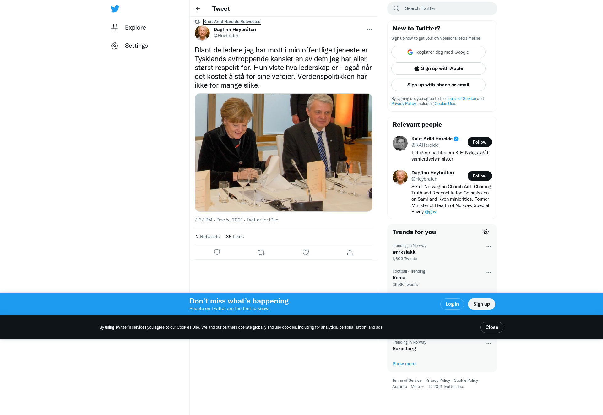 RT @Hoybraten: Blant de ledere jeg har møtt i min offentlige tjeneste er Tysklands avtroppende kansler en av dem jeg har aller størst respekt for. Hun viste hva lederskap er - også når det kostet å stå for sine verdier. Verdenspolitikken har ikke for mange slike. https://t.co/LmLEVs94ZD