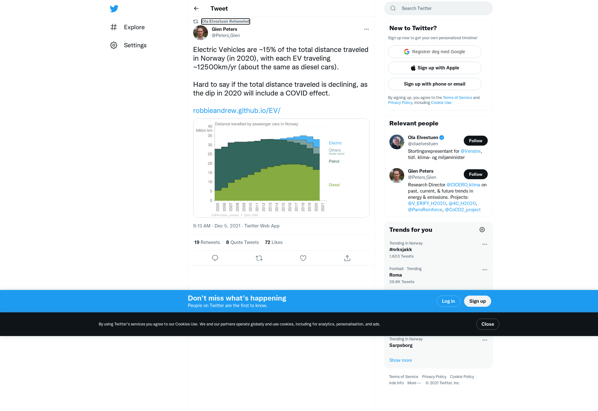 RT @Peters_Glen: Electric Vehicles are ~15% of the total distance traveled in Norway (in 2020), with each EV traveling ~12500km/yr (about the same as diesel cars).