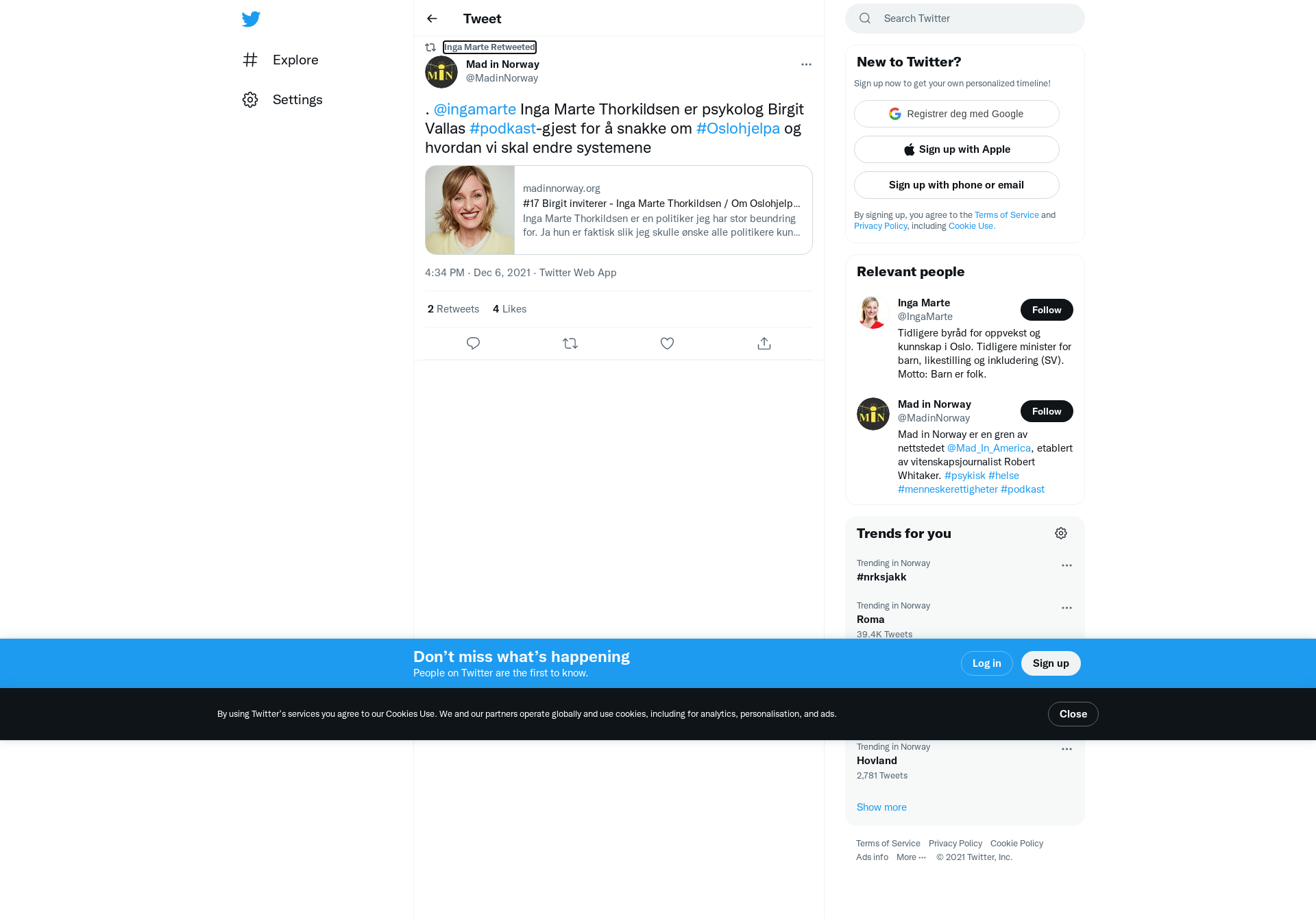 RT @MadinNorway: . @ingamarte Inga Marte Thorkildsen er psykolog Birgit Vallas #podkast-gjest for å snakke om #Oslohjelpa og hvordan vi skal endre systemene https://t.co/rwLq18ysTL