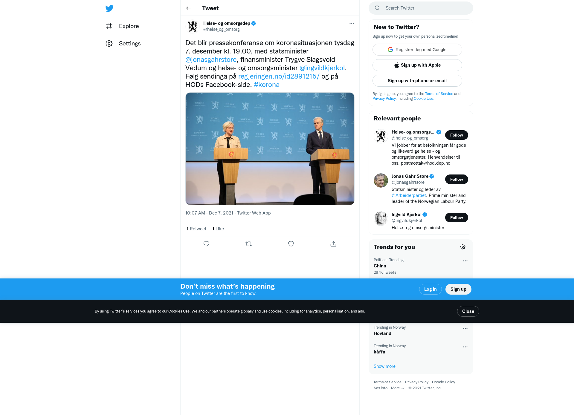 Det blir pressekonferanse om koronasituasjonen tysdag 7. desember kl. 19.00, med statsminister @jonasgahrstore, finansminister Trygve Slagsvold Vedum og helse- og omsorgsminister @ingvildkjerkol. Følg sendinga på https://t.co/CoD28Xz7Dg og på HODs Facebook-side. #korona https://t.co/gpfmzTCe5b
