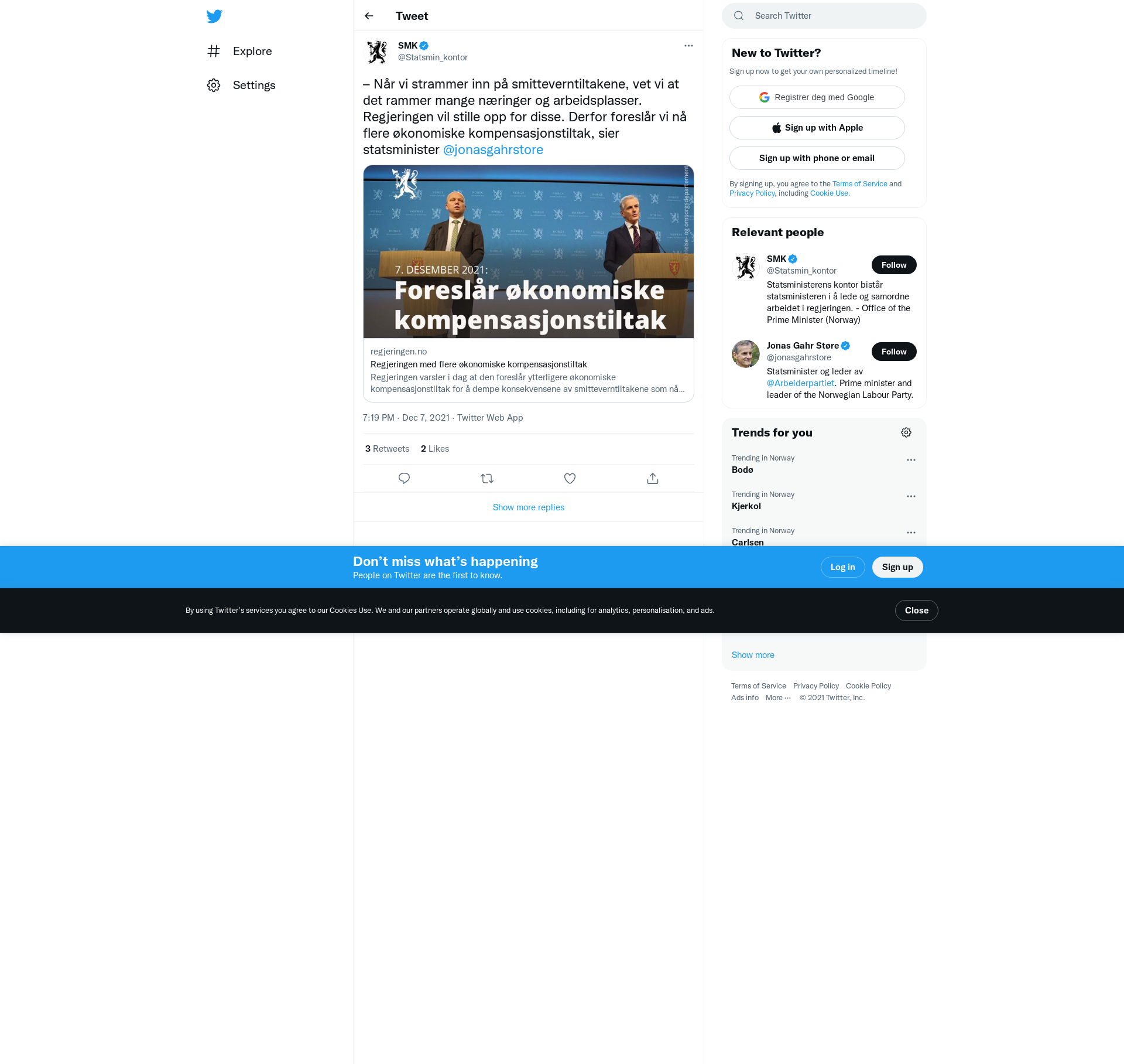 – Når vi strammer inn på smitteverntiltakene, vet vi at det rammer mange næringer og arbeidsplasser. Regjeringen vil stille opp for disse. Derfor foreslår vi nå flere økonomiske kompensasjonstiltak, sier statsminister @jonasgahrstore