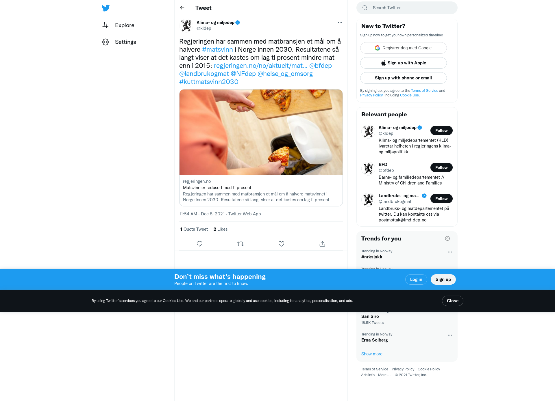Regjeringen har sammen med matbransjen et mål om å halvere #matsvinn i Norge innen 2030. Resultatene så langt viser at det kastes om lag ti prosent mindre mat enn i 2015: https://t.co/TK1zm9nw6Z @bfdep @landbrukogmat @NFdep @helse_og_omsorg #kuttmatsvinn2030