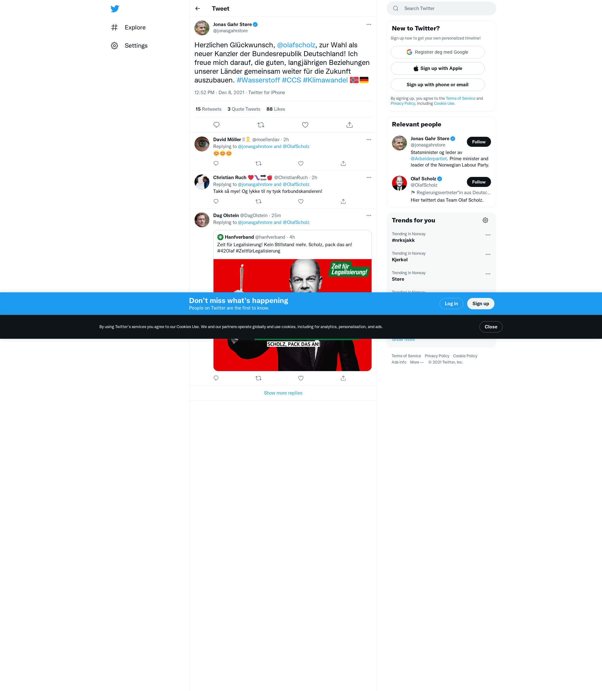 Herzlichen Glückwunsch, @olafscholz, zur Wahl als neuer Kanzler der Bundesrepublik Deutschland! Ich freue mich darauf, die guten, langjährigen Beziehungen unserer Länder gemeinsam weiter für die Zukunft auszubauen. #Wasserstoff #CCS #Klimawandel 🇳🇴🇩🇪