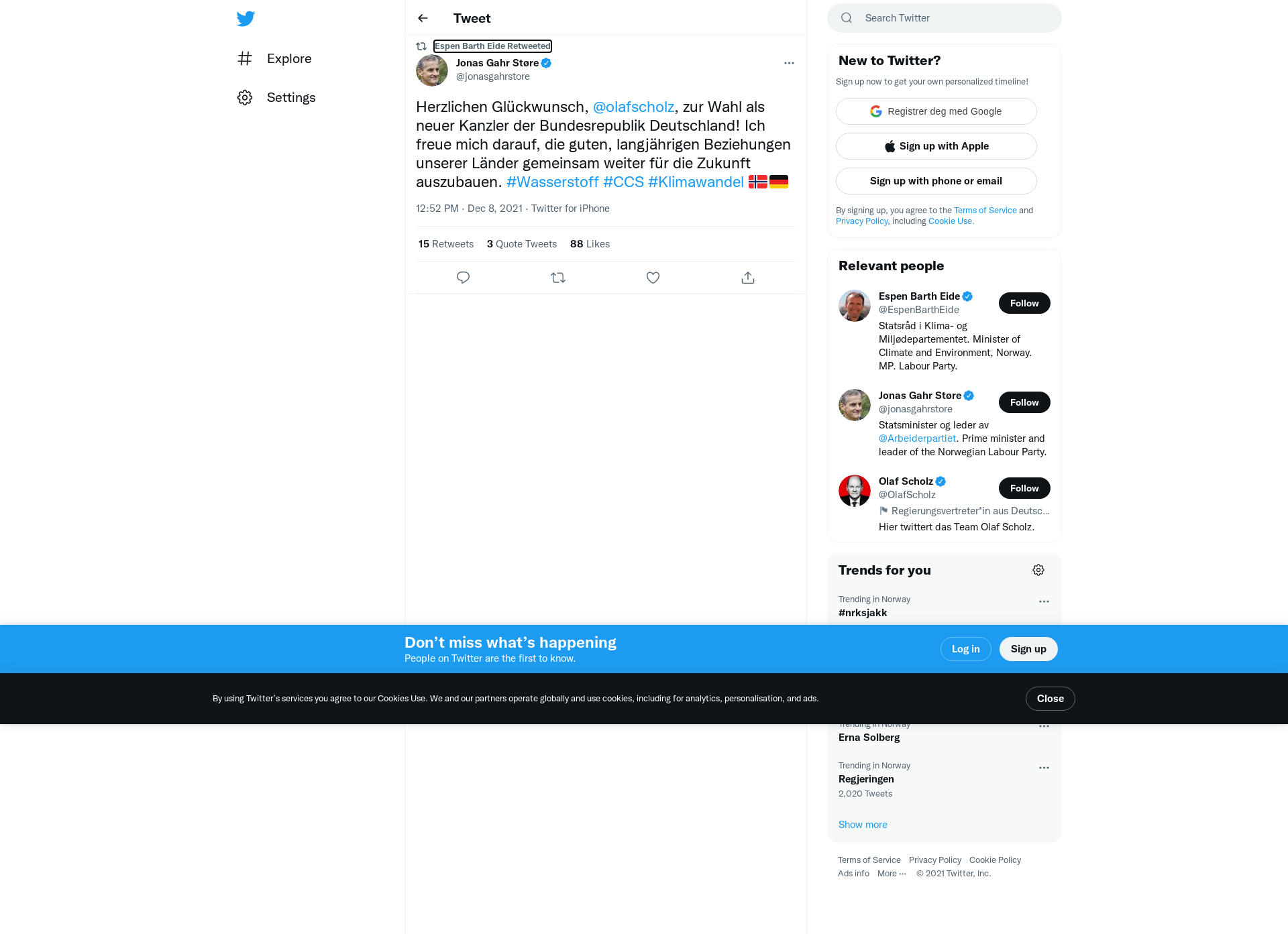 RT @jonasgahrstore: Herzlichen Glückwunsch, @olafscholz, zur Wahl als neuer Kanzler der Bundesrepublik Deutschland! Ich freue mich darauf, die guten, langjährigen Beziehungen unserer Länder gemeinsam weiter für die Zukunft auszubauen. #Wasserstoff #CCS #Klimawandel 🇳🇴🇩🇪