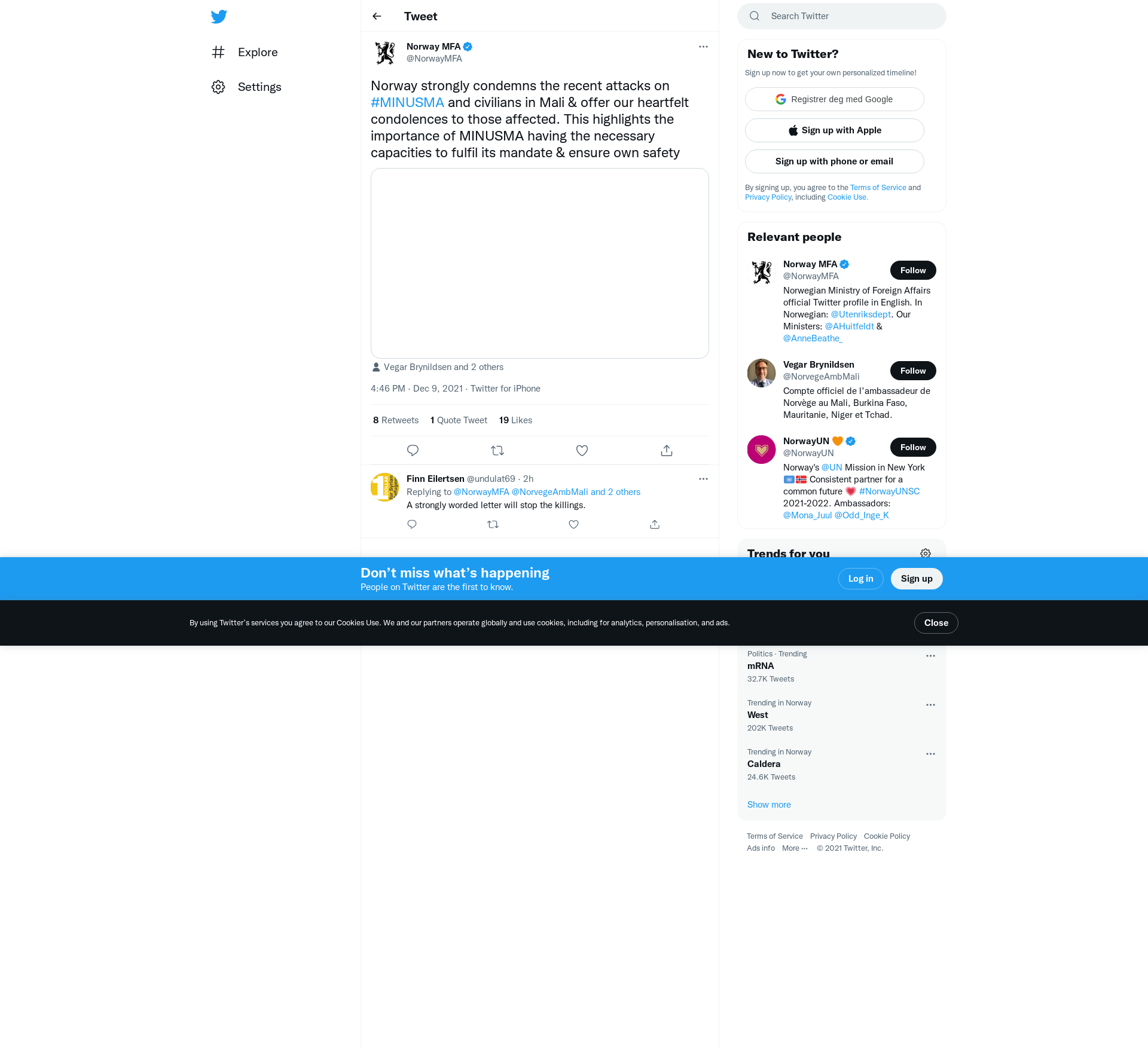 Norway strongly condemns the recent attacks on #MINUSMA and civilians in Mali & offer our heartfelt condolences to those affected. This highlights the importance of MINUSMA having the necessary capacities to fulfil its mandate & ensure own safety https://t.co/kJE2PLp6iW