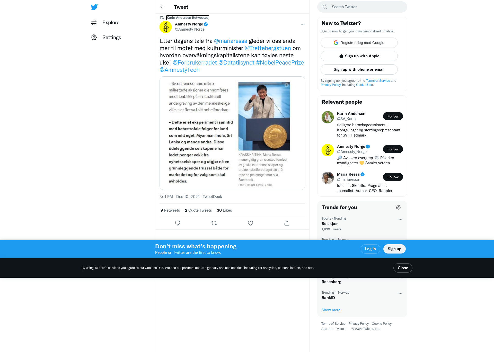 RT @Amnesty_Norge: Etter dagens tale fra @mariaressa gleder vi oss enda mer til møtet med kulturminister @Trettebergstuen om hvordan overvåkningskapitalistene kan tøyles neste uke! @Forbrukerradet @Datatilsynet #NobelPeacePrize @AmnestyTech https://t.co/SvgGYoJtYM