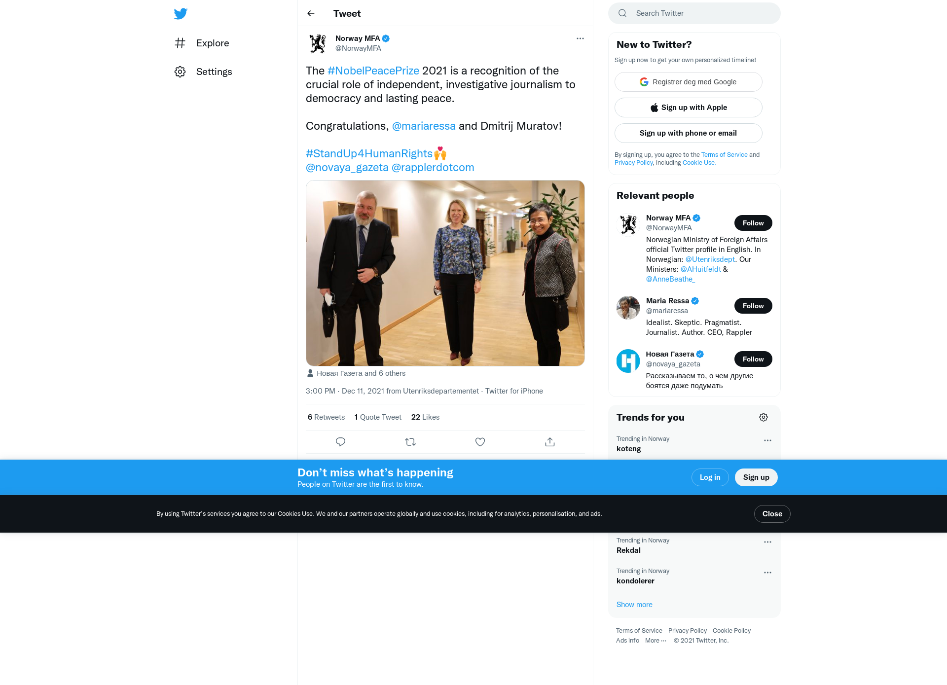 The #NobelPeacePrize 2021 is a recognition of the crucial role of independent, investigative journalism to democracy and lasting peace.