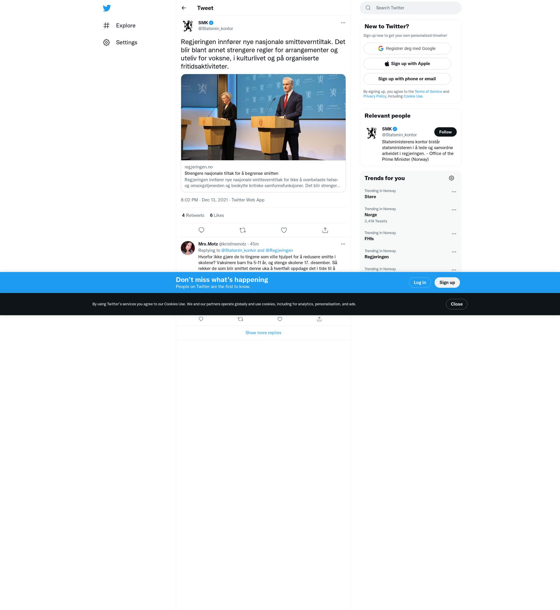 Regjeringen innfører nye nasjonale smitteverntiltak for ikke å overbelaste helse- og omsorgstjenesten og beskytte kritiske samfunnsfunksjoner. Det blir strengere regler for arrangementer og uteliv for voksne, i kulturlivet og på organiserte fritidsakti...