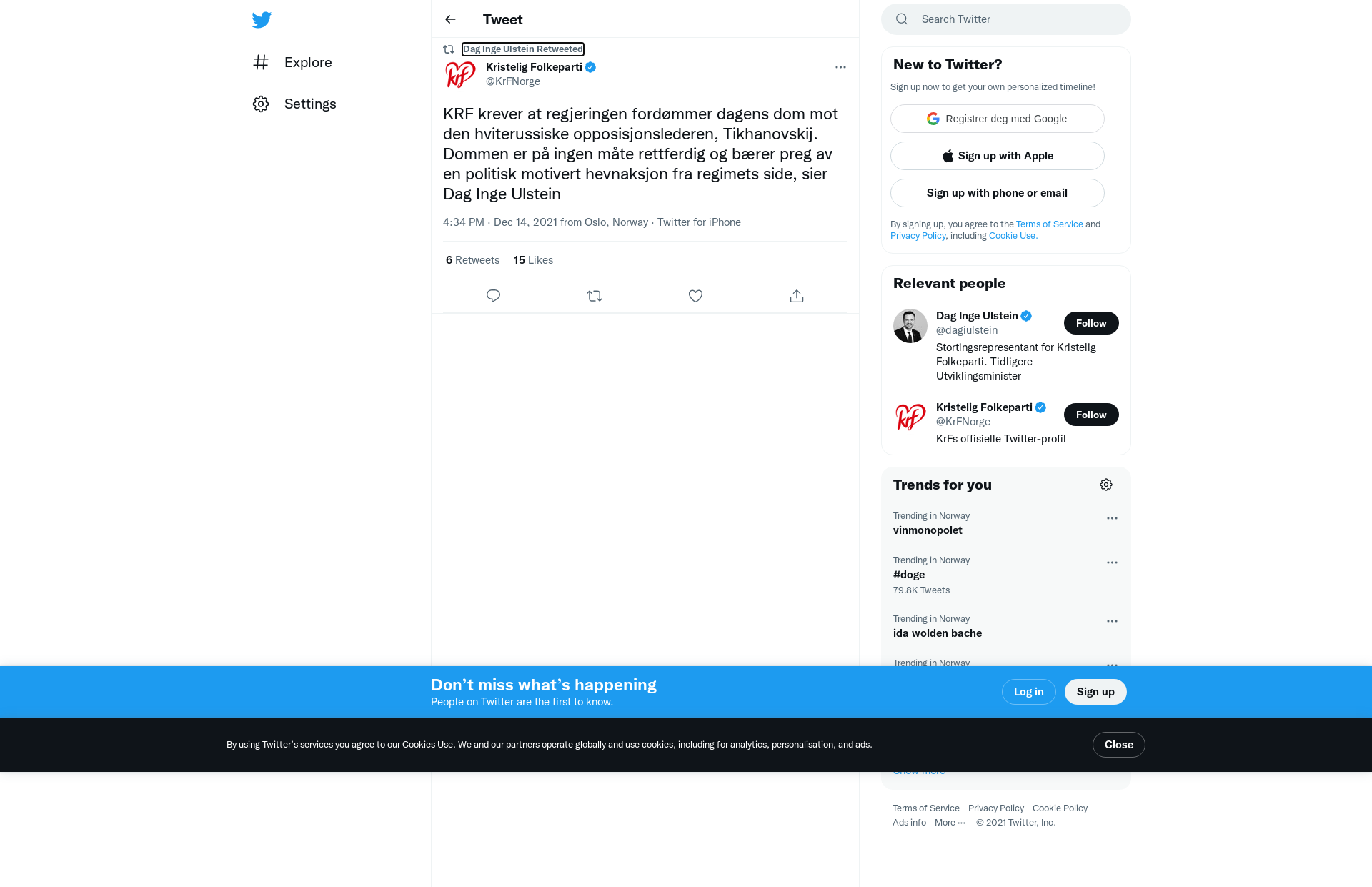 RT @KrFNorge: KRF krever at regjeringen fordømmer dagens dom mot den hviterussiske opposisjonslederen, Tikhanovskij. Dommen er på ingen måte rettferdig og bærer preg av en politisk motivert hevnaksjon fra regimets side, sier Dag Inge Ulstein