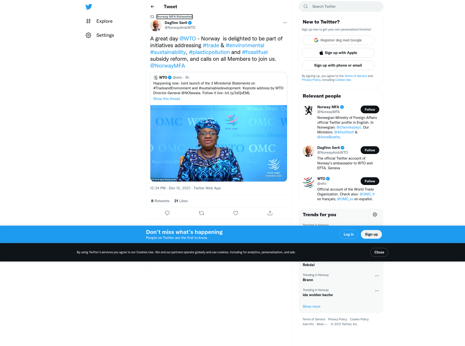 RT @NorwayAmbWTO: A great day @WTO - Norway is delighted to be part of initiatives addressing #trade & #environmental #sustainability, #plasticpollution and #fossilfuel subsidy reform, and calls on all Members to join us. @NorwayMFA