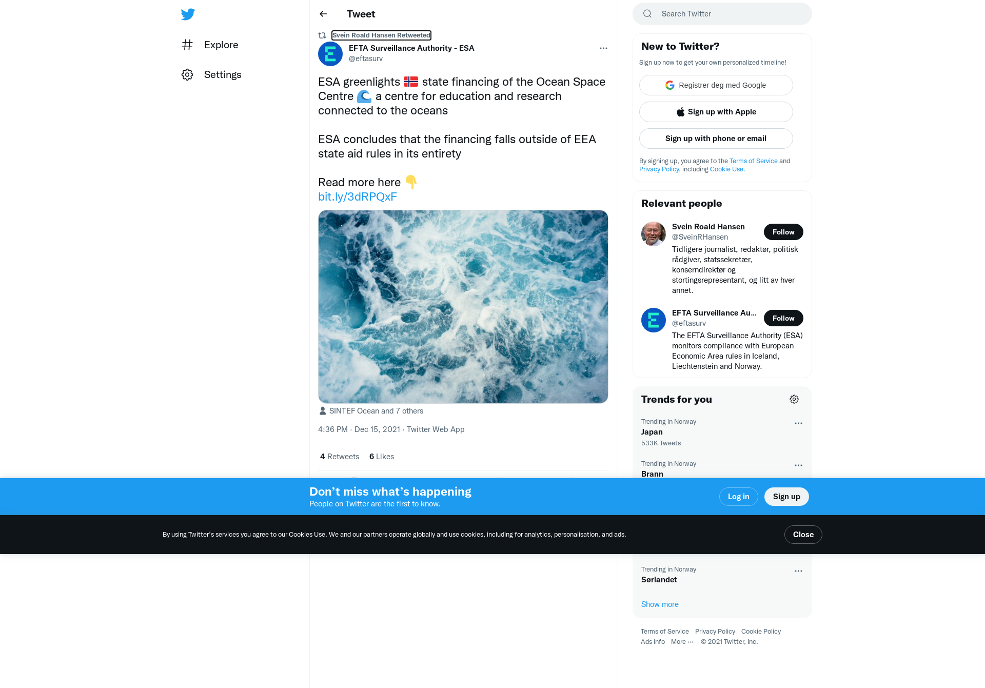 RT @eftasurv: ESA greenlights 🇳🇴 state financing of the Ocean Space Centre 🌊 a centre for education and research connected to the oceans