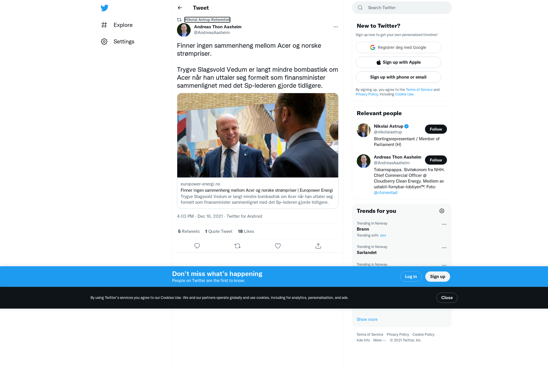 RT @AndreasAasheim: Finner ingen sammenheng mellom Acer og norske strømpriser. Trygve Slagsvold Vedum er langt mindre bombastisk om Acer n…