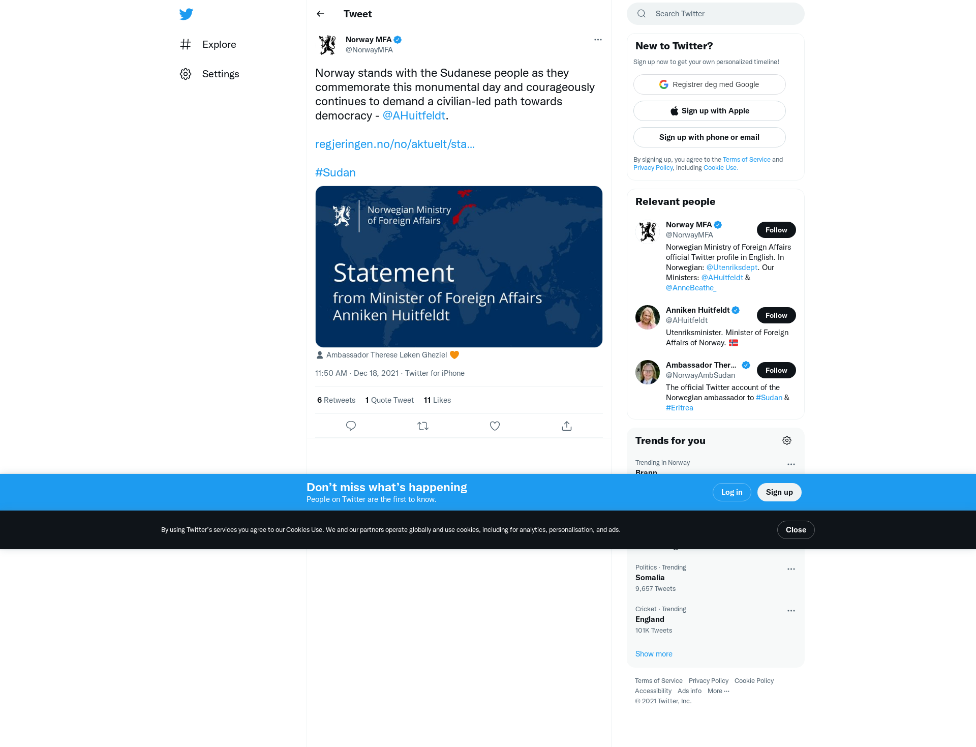 Statement on Sudan from the Norwegian Minister of Foreign Affairs